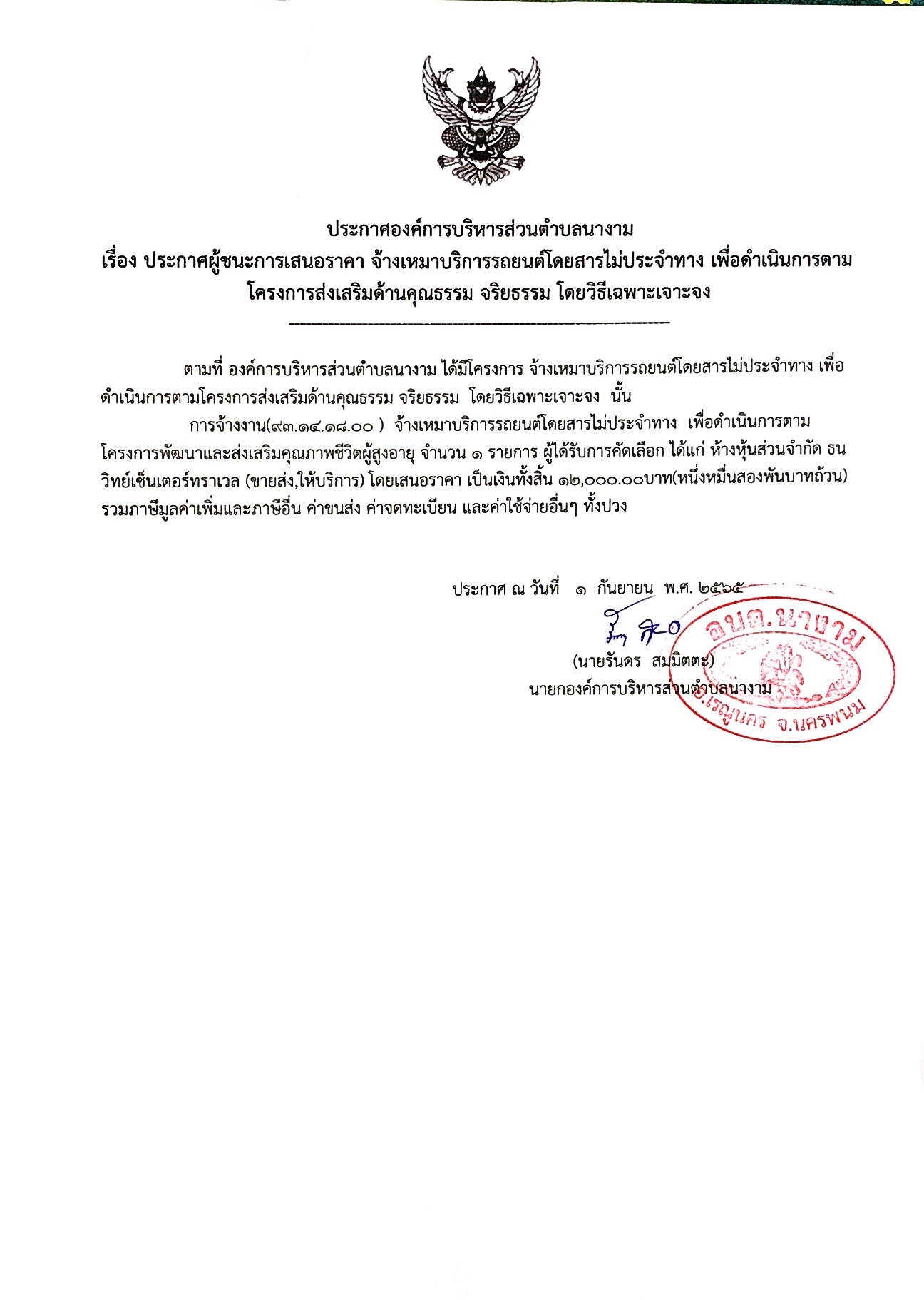 ประกาศผู้ชนะการเสนอราคา จ้างเหมาบริการรถยนต์โดยสารไม่ประจำทาง เพื่อดำเนินการตามโครงการส่งเสริมด้านคุณธรรม จริยธรรม โดยวิธีเฉพาะเจาะจง
