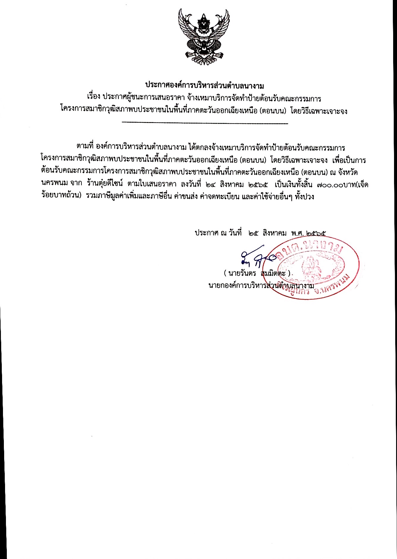 ประกาศผู้ชนะการเสนอราคา จ้างเหมาบริการจัดทำป้ายต้อนรับคณะกรรมการ โครงการสมาชิกวุฒิสภาพบประชาชนในพื้นที่ภาคตะวันออกเฉียงเหนือ (ตอนบน) โดยวิธีเฉพาะเจาะจง