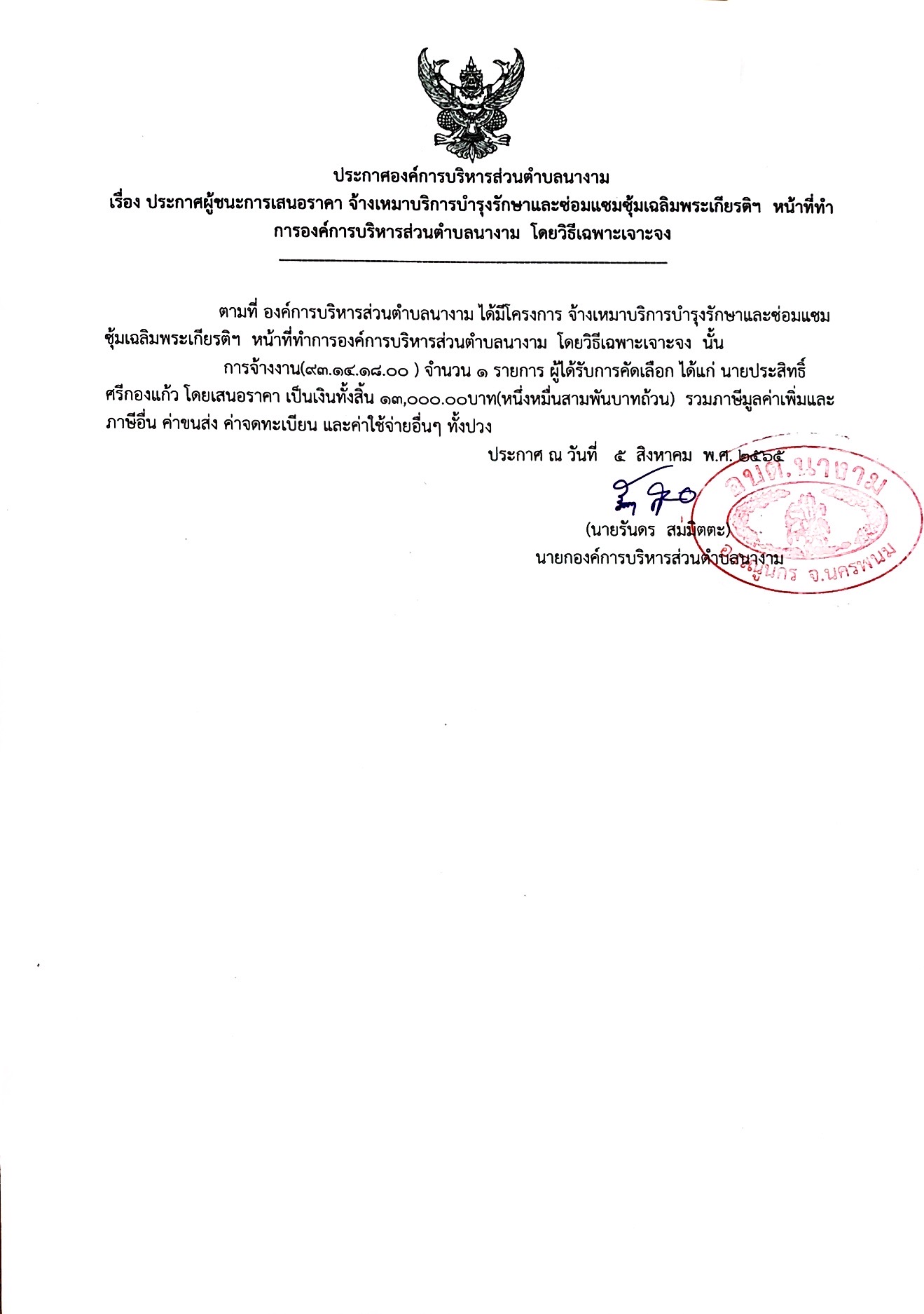 ชื่อเรื่อง : ประกาศผู้ชนะการเสนอราคา จ้างเหมาบริการบำรุงรักษาและซ่อมแซมซุ้มเฉลิมพระเกียรติฯ หน้าที่ทำการองค์การบริหารส่วนตำบลนางาม โดยวิธีเฉพาะเจาะจง