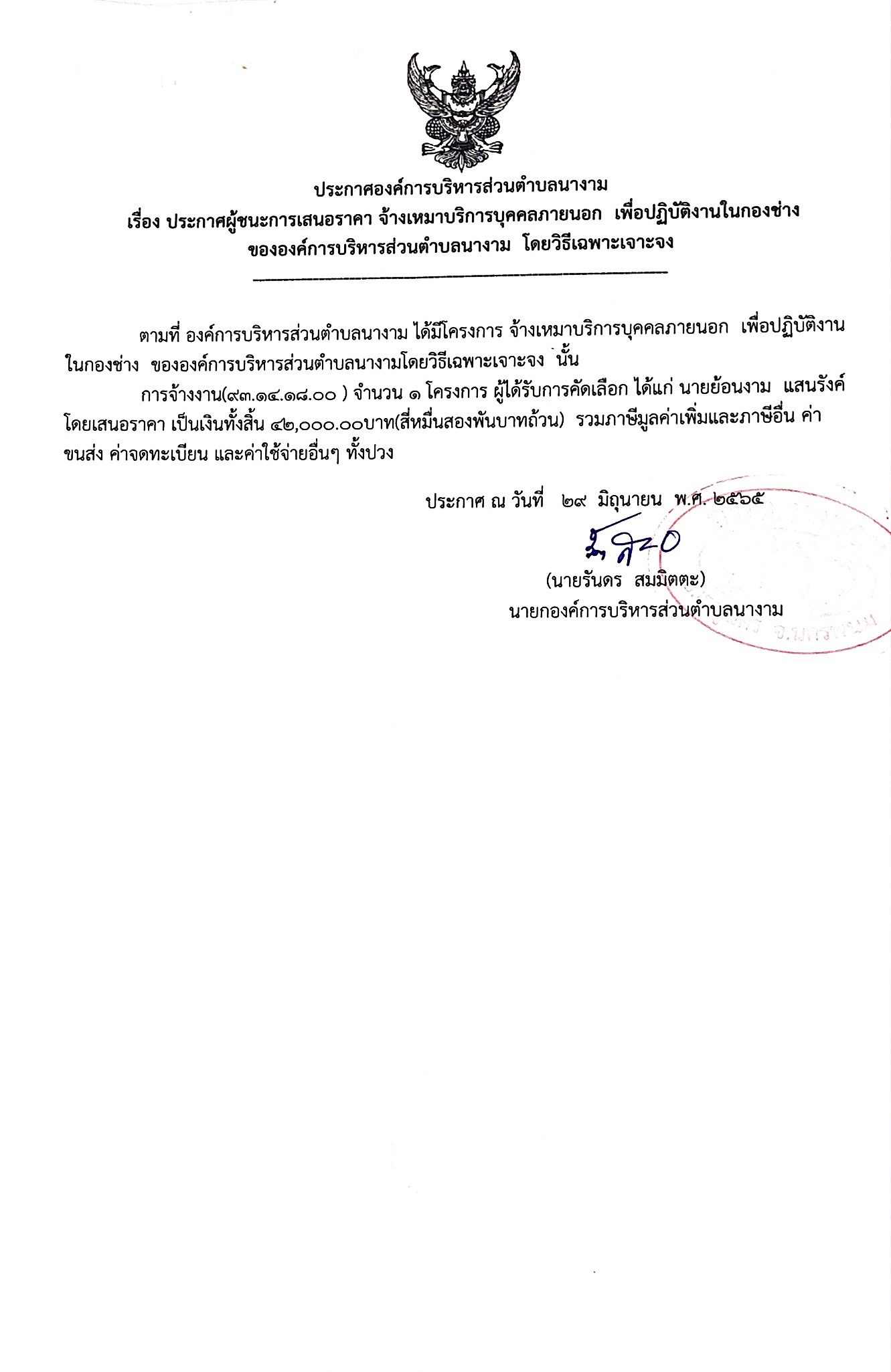 ประกาศผู้ชนะการเสนอราคา จ้างเหมาบริการบุคคลภายนอก เพื่อปฏิบัติงานในกองช่าง ขององค์การบริหารส่วนตำบลนางาม โดยวิธีเฉพาะเจาะจง