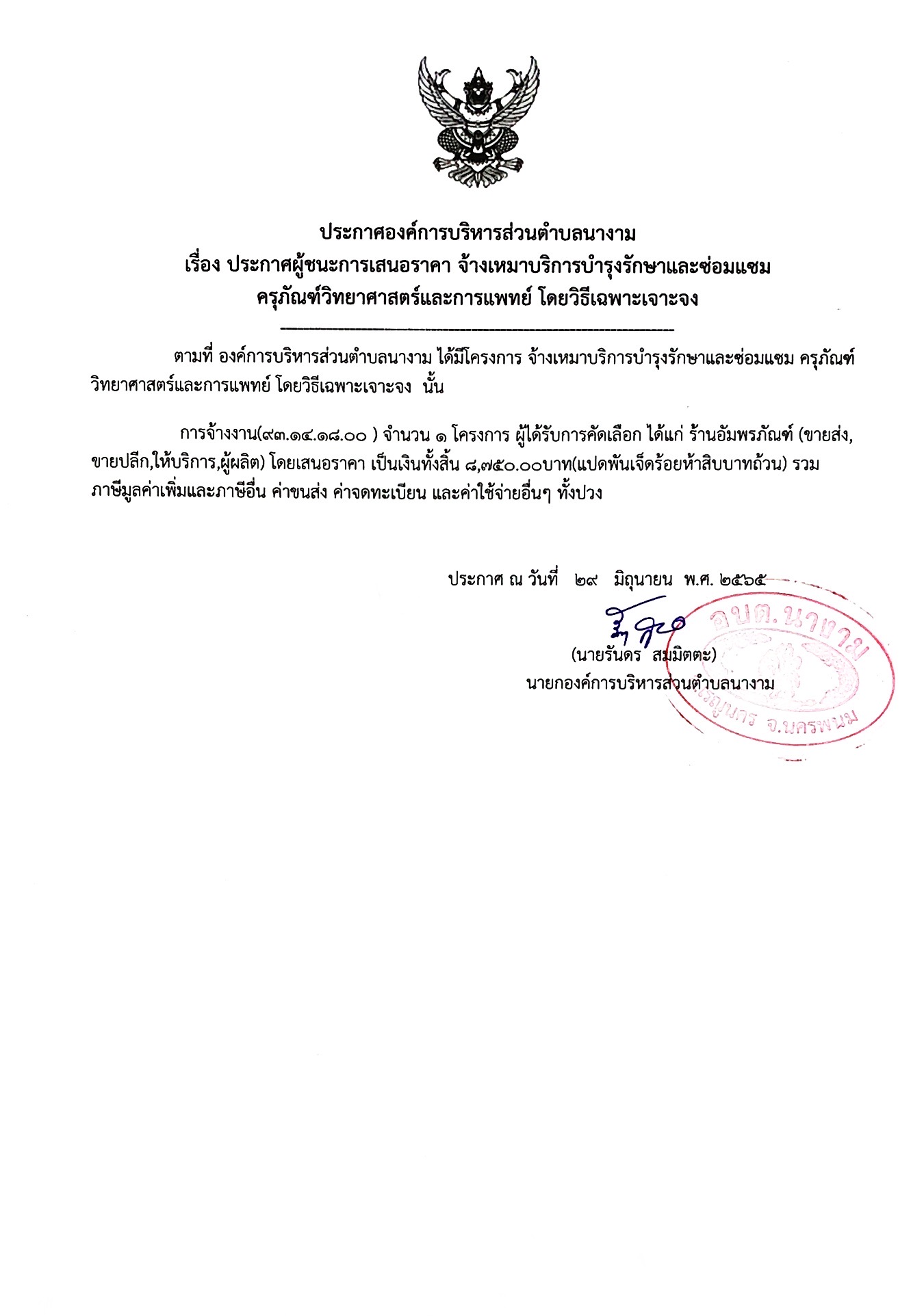 ประกาศผู้ชนะการเสนอราคา จ้างเหมาบริการบำรุงรักษาและซ่อมแซม ครุภัณฑ์วิทยาศาสตร์และการแพทย์ โดยวิธีเฉพาะเจาะจง