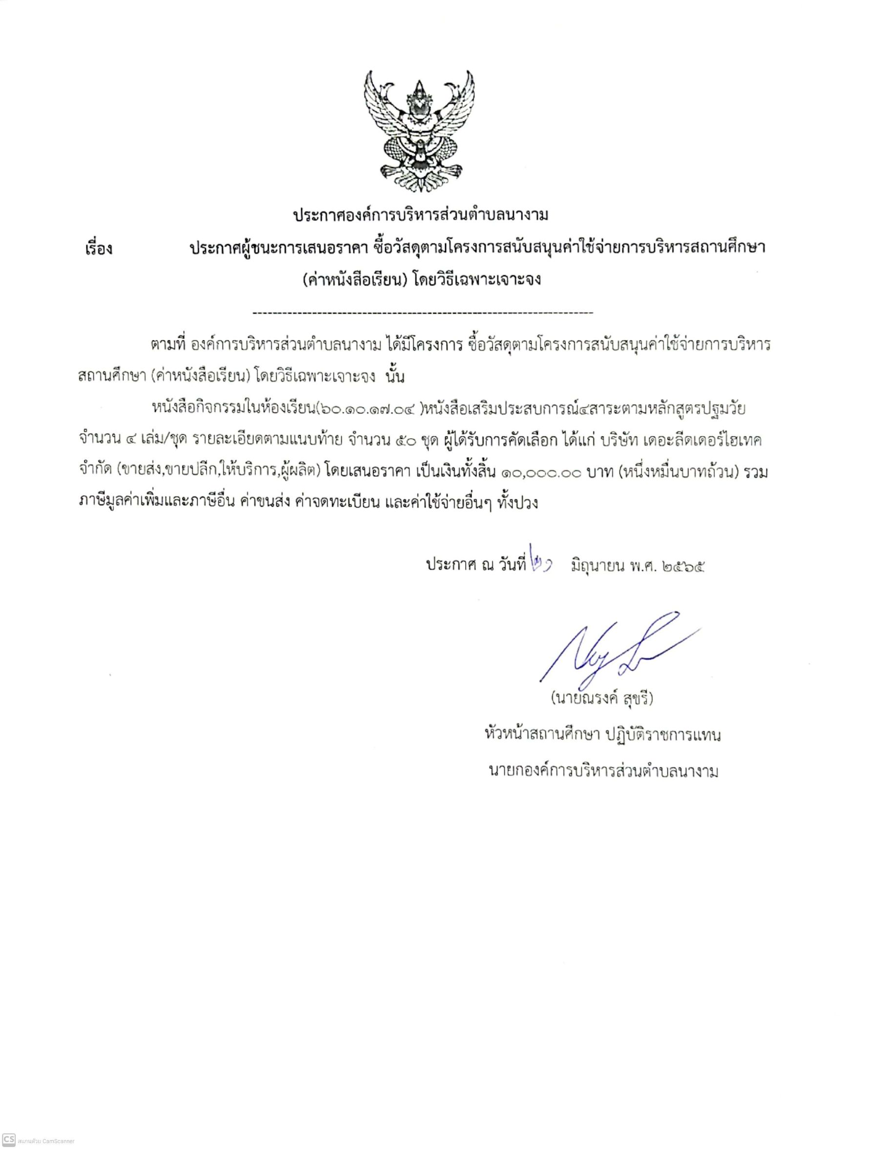 ประกาศผู้ชนะการเสนอราคาซื้อวัสดุตามโครงการสนับสนุนค่าใช้จ่ายการบริหารสถานศึกษา(ค่าหนังสือเรียน)โดยวิธีเฉพาะเจาะจง