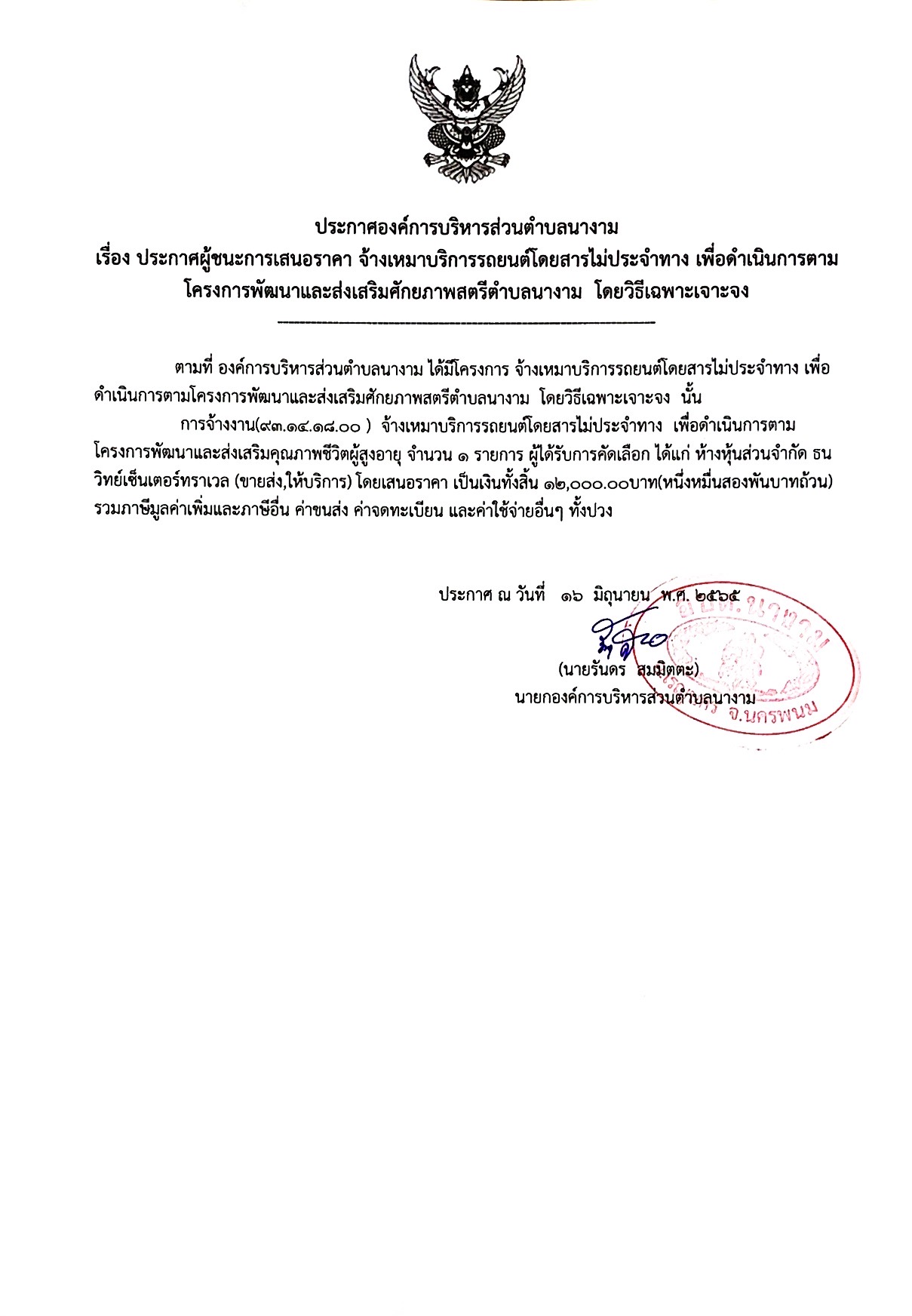 ประกาศผู้ชนะการเสนอราคา จ้างเหมาบริการรถยนต์โดยสารไม่ประจำทาง เพื่อดำเนินการตามโครงการพัฒนาและส่งเสริมศักยภาพสตรีตำบลนางาม โดยวิธีเฉพาะเจาะจง