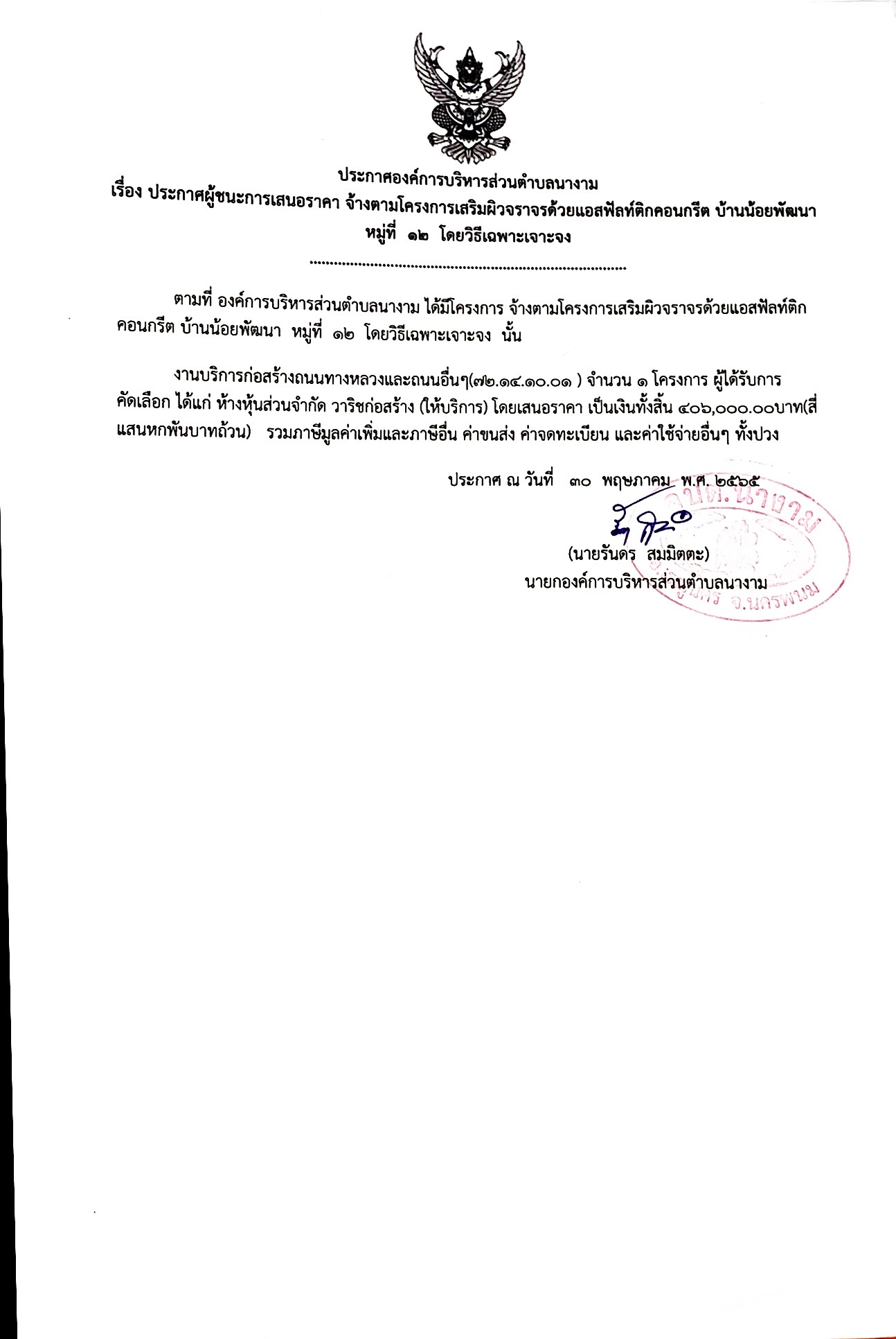 ประกาศผู้ชนะการเสนอราคา จ้างตามโครงการเสริมผิวจราจรด้วยแอสฟัลท์ติกคอนกรีต บ้านน้อยพัฒนา หมู่ที่ ๑๒ โดยวิธีเฉพาะเจาะจง