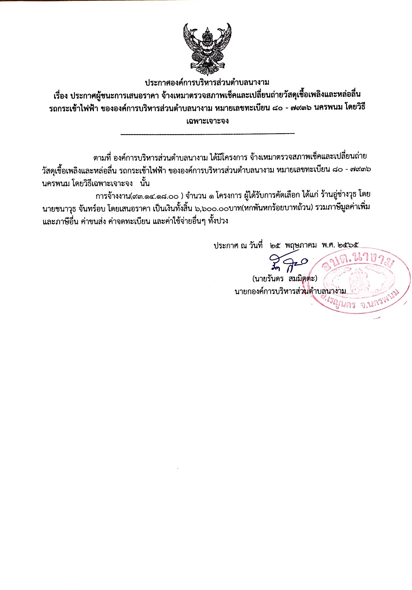 ชื่อเรื่อง : ประกาศผู้ชนะการเสนอราคา จ้างเหมาตรวจสภาพเช็คและเปลี่ยนถ่ายวัสดุเชื้อเพลิงและหล่อลื่น รถกระเช้าไฟฟ้า ขององค์การบริหารส่วนตำบลนางาม หมายเลขทะเบียน ๘๐ - ๗๙๓๖ นครพนม โดยวิธีเฉพาะเจาะจง