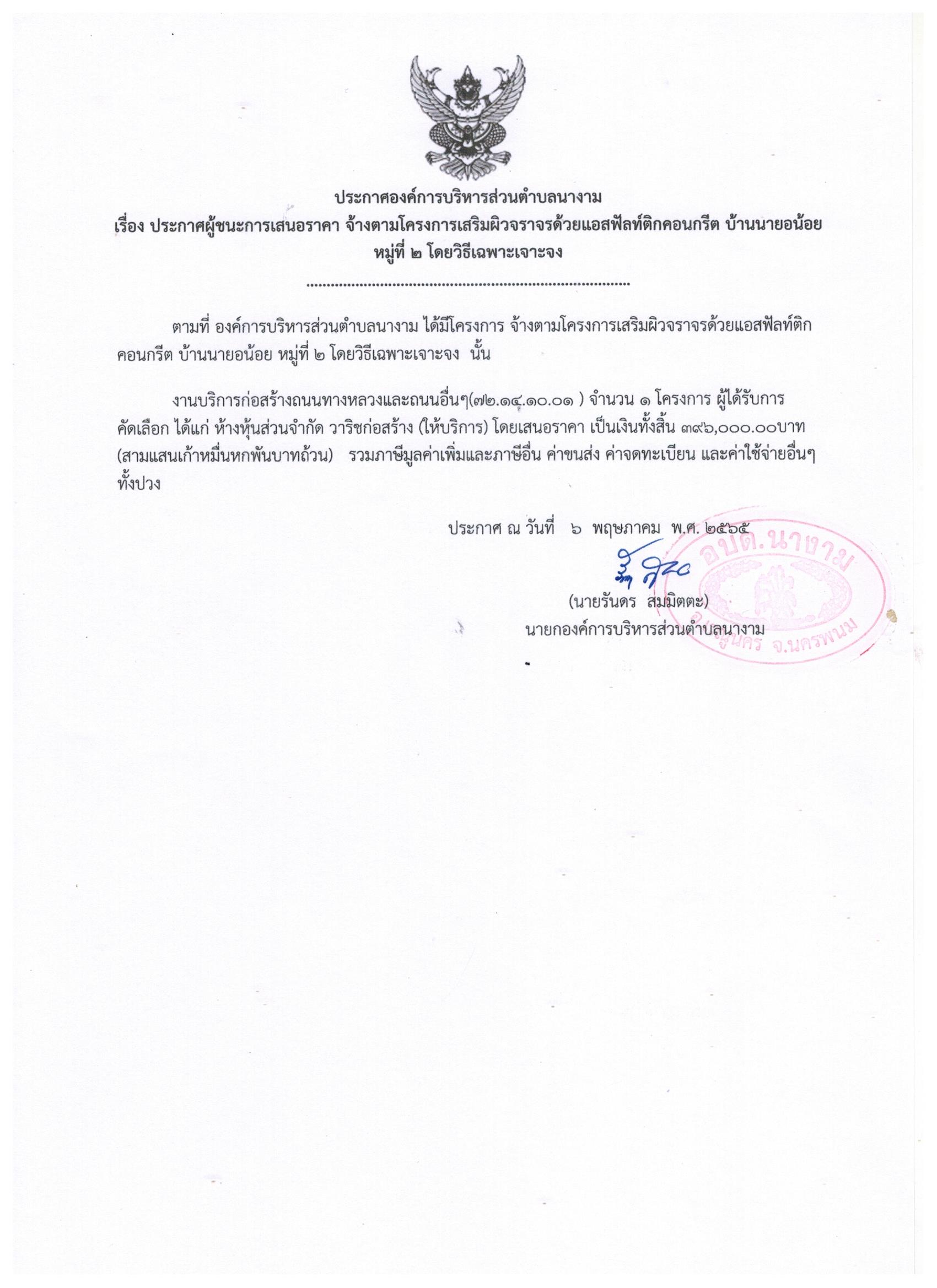 ประกาศผู้ชนะการเสนอราคา จ้างตามโครงการเสริมผิวจราจรด้วยแอสฟัลท์ติกคอนกรีต บ้านนายอน้อย หมู่ที่ ๒ โดยวิธีเฉพาะเจาะจง