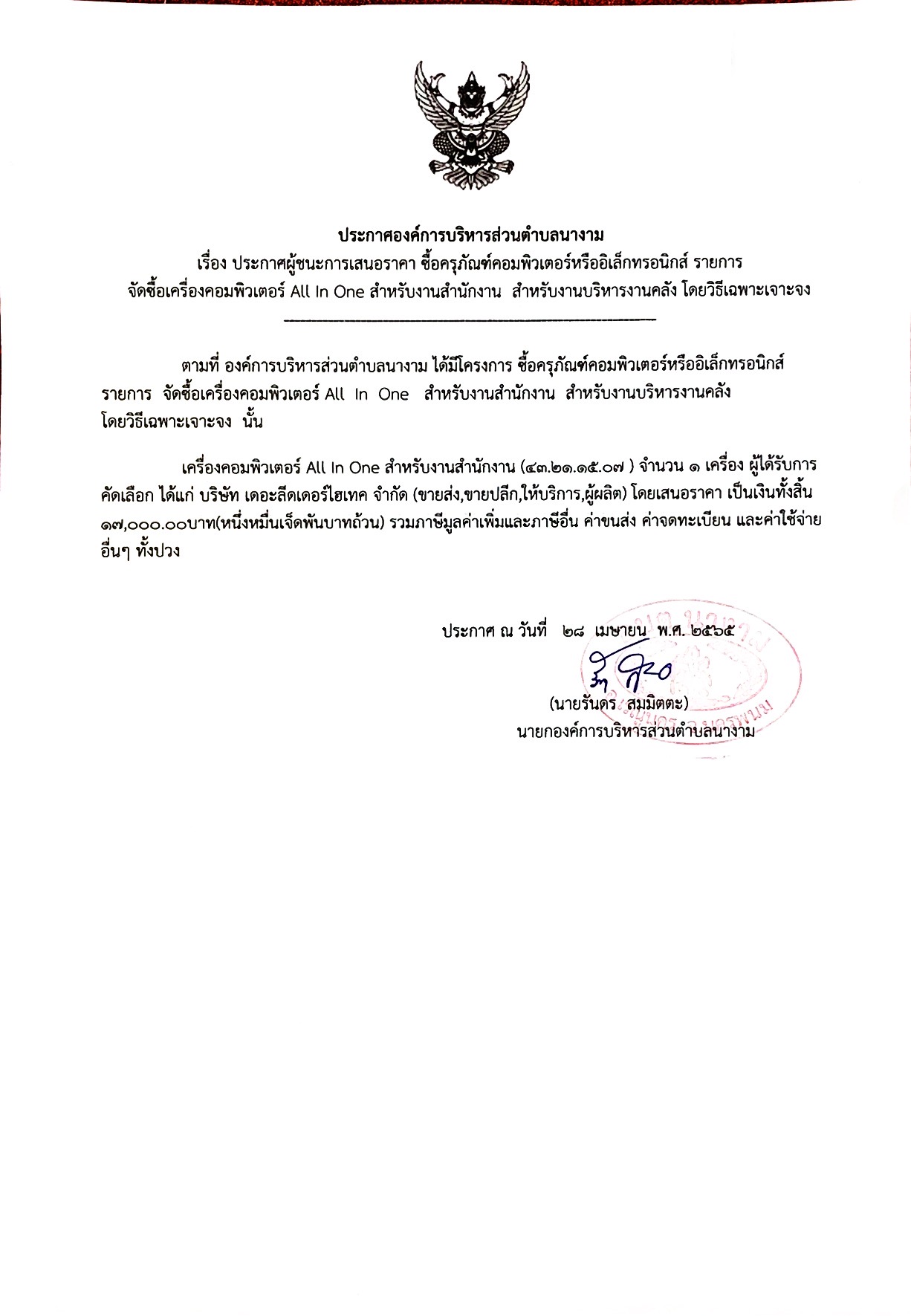 ชื่อเรื่อง : ประกาศผู้ชนะการเสนอราคา ซื้อครุภัณฑ์คอมพิวเตอร์หรืออิเล็กทรอนิกส์ รายการ จัดซื้อเครื่องคอมพิวเตอร์ All In One สำหรับงานสำนักงาน สำหรับงานบริหารงานคลัง โดยวิธีเฉพาะเจาะจง