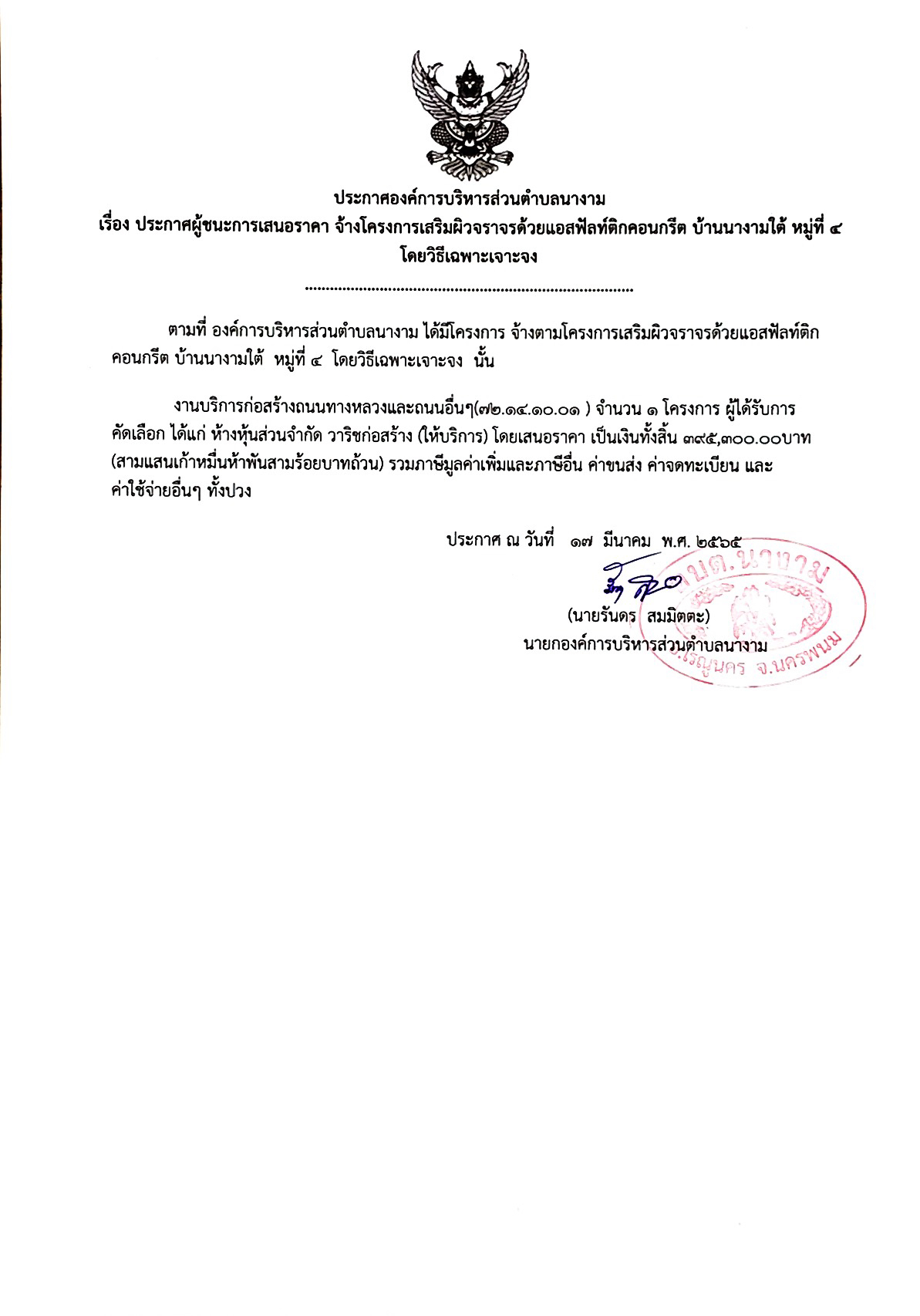 ประกาศผู้ชนะการเสนอราคา จ้างโครงการเสริมผิวจราจรด้วยแอสฟัลท์ติกคอนกรีต บ้านนางามใต้ หมู่ที่ 4 โดยวิธีเฉพาะเจาะจง