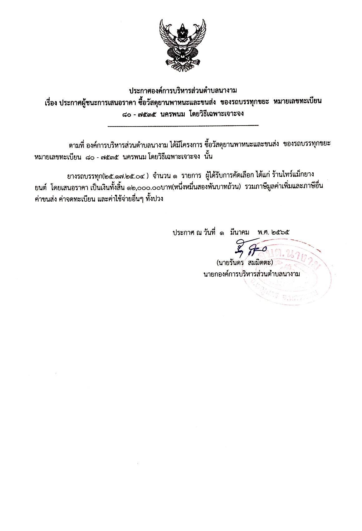 ประกาศผู้ชนะการเสนอราคา ซื้อวัสดุยานพาหนะและขนส่ง ของรถบรรทุกขยะ หมายเลขทะเบียน ๘๐ - ๗๕๓๕ นครพนม โดยวิธีเฉพาะเจาะจง