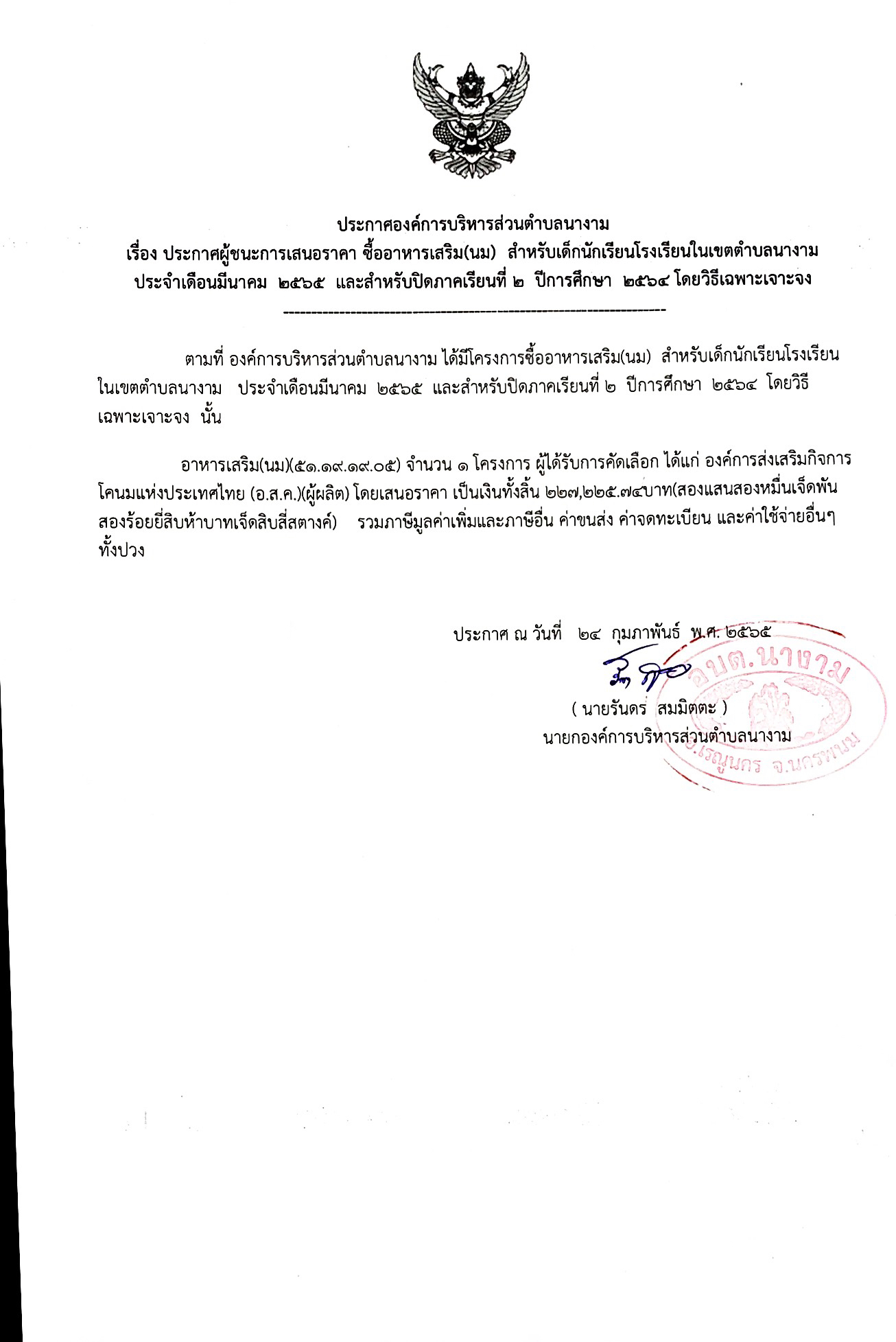 ชื่อเรื่อง : ประกาศผู้ชนะการเสนอราคา ซื้ออาหารเสริม(นม) สำหรับเด็กนักเรียนโรงเรียนในเขตตำบลนางาม ประจำเดือนมีนาคม 2565 และสำหรับปิดภาคเรียนที่ 2 ปีการศึกษา 2564 โดยวิธีเฉพาะเจาะจง