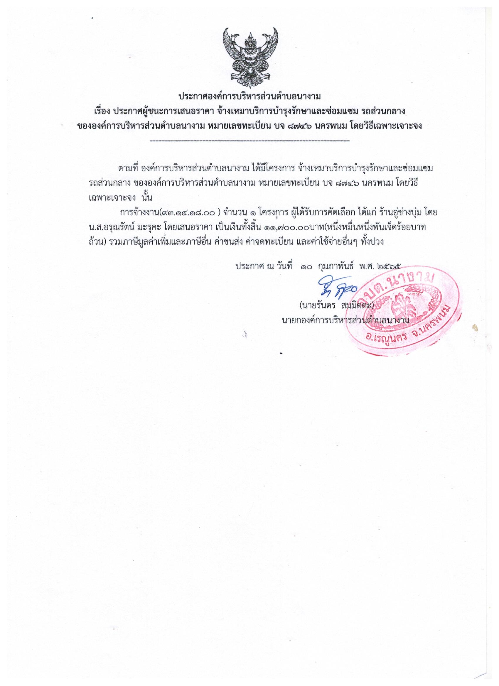 ชื่อเรื่อง : ประกาศผู้ชนะการเสนอราคา จ้างเหมาบริการบำรุงรักษาและซ่อมแซม รถส่วนกลาง ขององค์การบริหารส่วนตำบลนางาม หมายเลขทะเบียน บจ ๘๗๔๖ นครพนม โดยวิธีเฉพาะเจาะจง