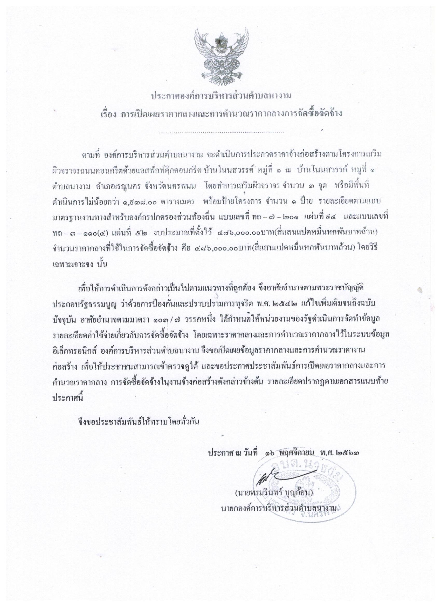 ประชาสัมพันธ์การเปิดเผยราคากลางตามโครงการเสริมผิวจราจรถนนคอนกรีตด้วยแอสฟัลท์ติกคอนกรีต บ้านโนนสวรรค์ หมูที่ 1 โดยวิธีเฉพาะเจาะจง