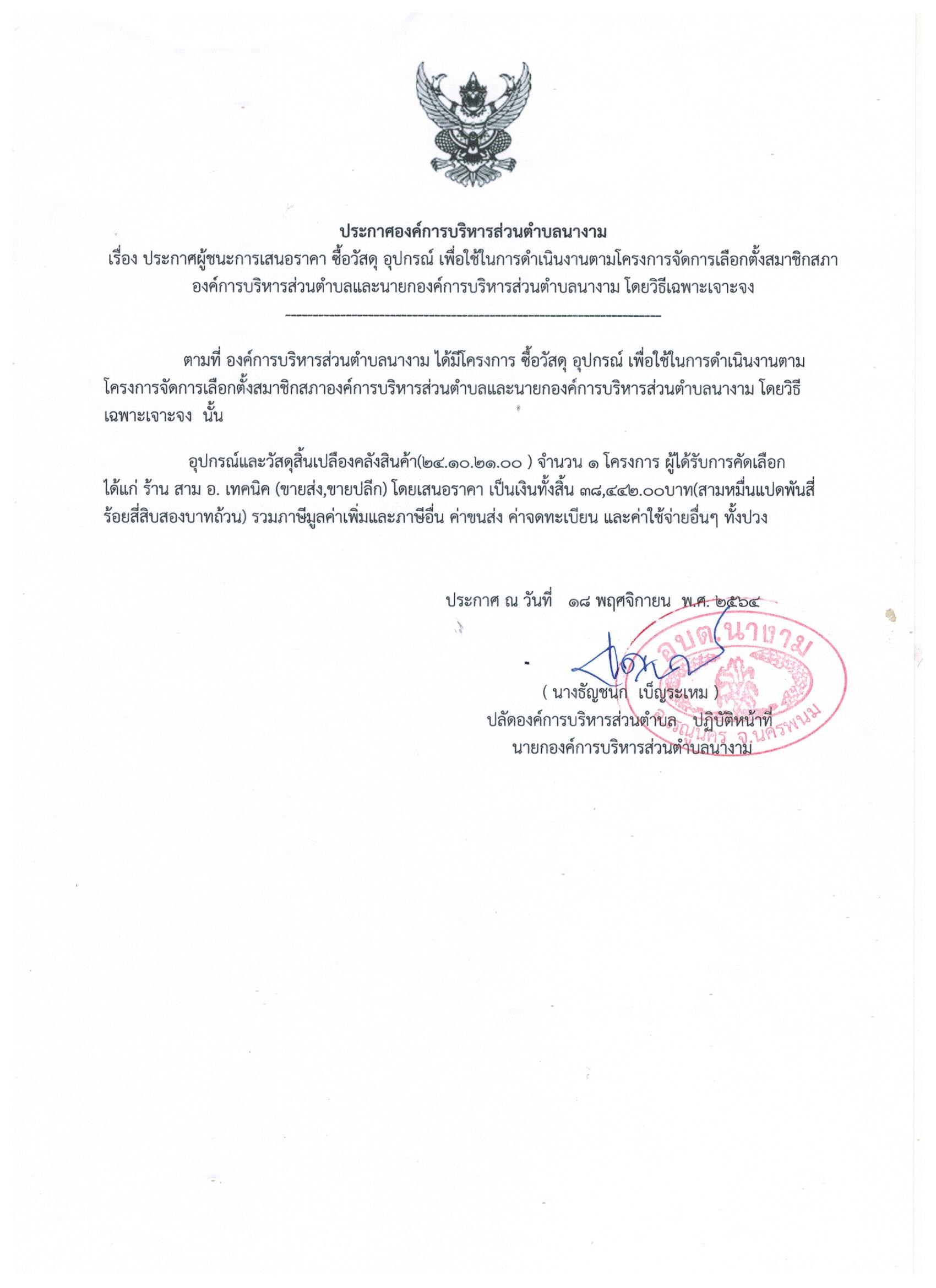ชื่อเรื่อง : ประกาศผู้ชนะการเสนอราคา ซื้อวัสดุ อุปกรณ์ เพื่อใช้ในการดำเนินงานตามโครงการจัดการเลือกตั้งสมาชิกสภาองค์การบริหารส่วนตำบลและนายกองค์การบริหารส่วนตำบลนางาม โดยวิธีเฉพาะเจาะจง