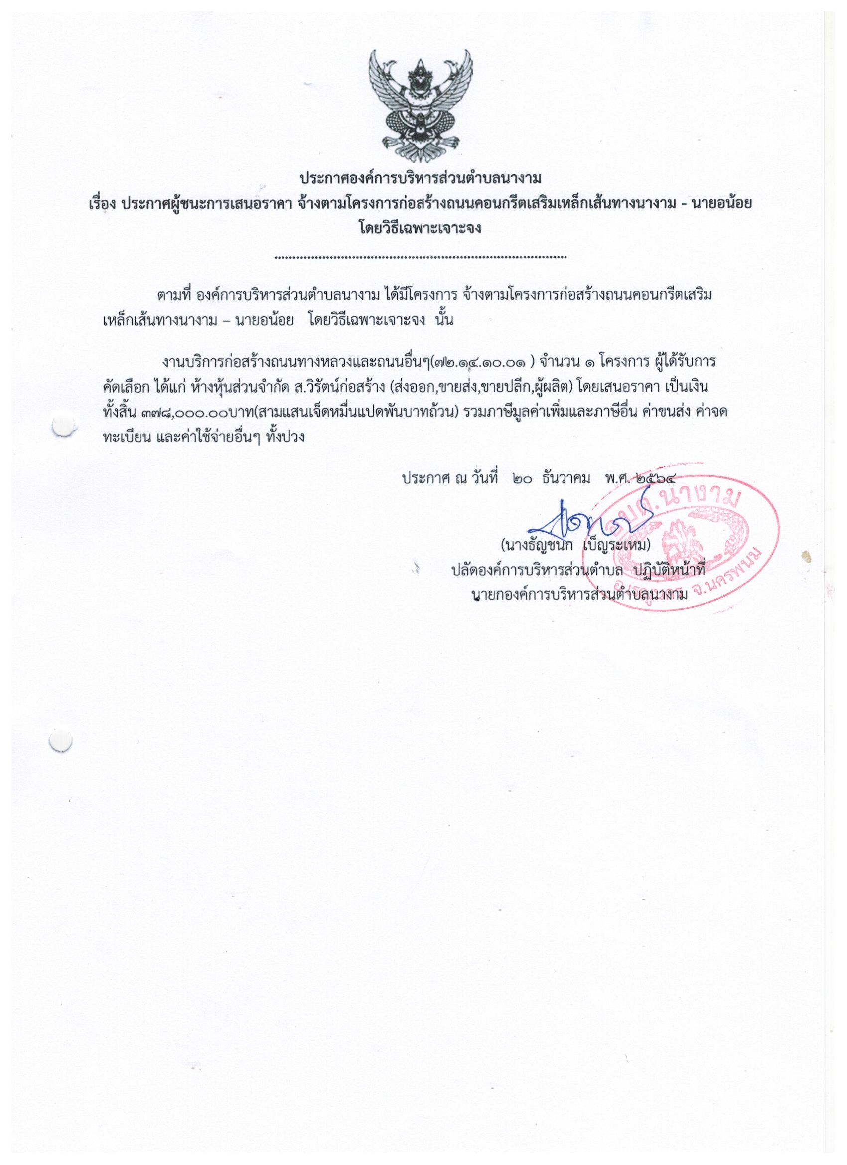 ประกาศผู้ชนะการเสนอราคา จ้างตามโครงการก่อสร้างถนนคอนกรีตเสริมเหล็กเส้นทางนางาม - นายอน้อย โดยวิธีเฉพาะเจาะจง