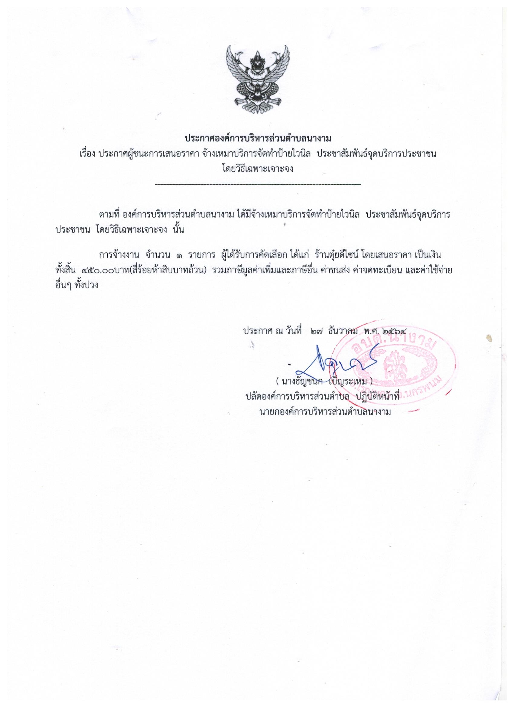 ประกาศผู้ชนะการเสนอราคา จ้างเหมาบริการจัดทำป้ายไวนิล ประชาสัมพันธ์จุดบริการประชาชน โดยวิธีเฉพาะเจาะจง