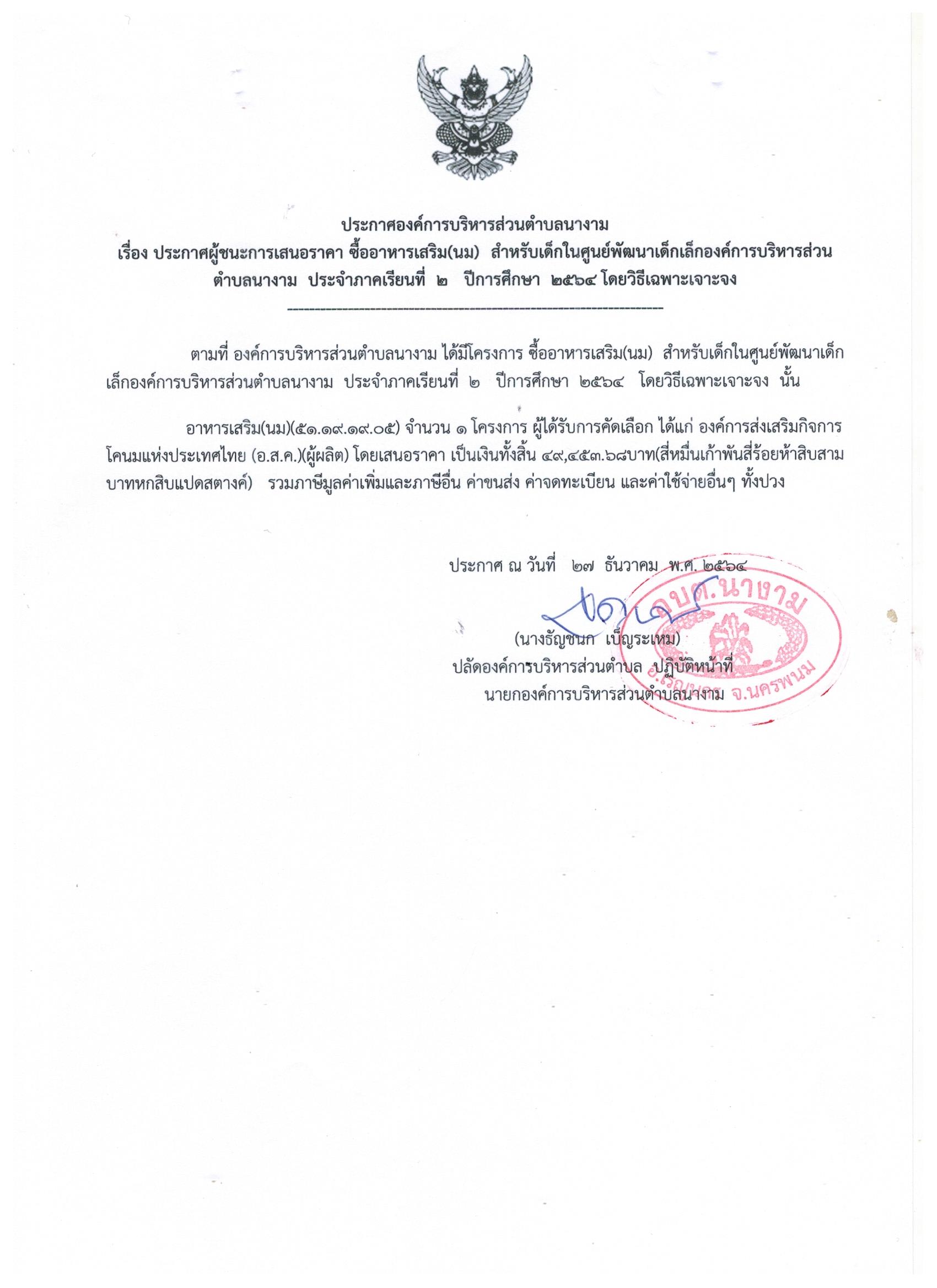 ประกาศผู้ชนะการเสนอราคา ซื้ออาหารเสริม(นม) สำหรับเด็กในศูนย์พัฒนาเด็กเล็กองค์การบริหารส่วนตำบลนางาม ประจำภาคเรียนที่ 2 ปีการศึกษา 2564 โดยวิธีเฉพาะเจาะจง