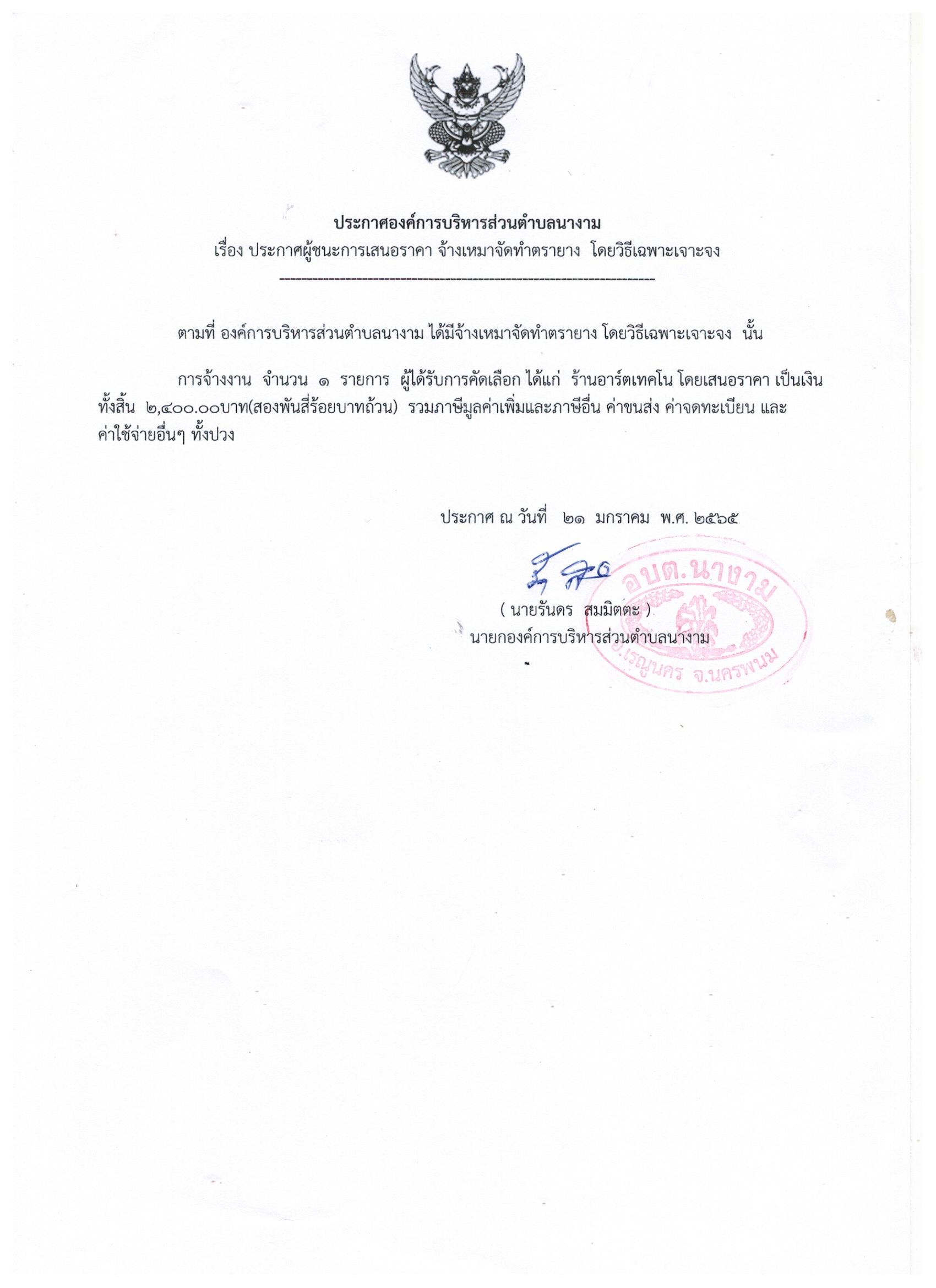ประกาศผู้ชนะการเสนอราคา จ้างเหมาจัดทำตรายาง โดยวิธีเฉพาะเจาะจง