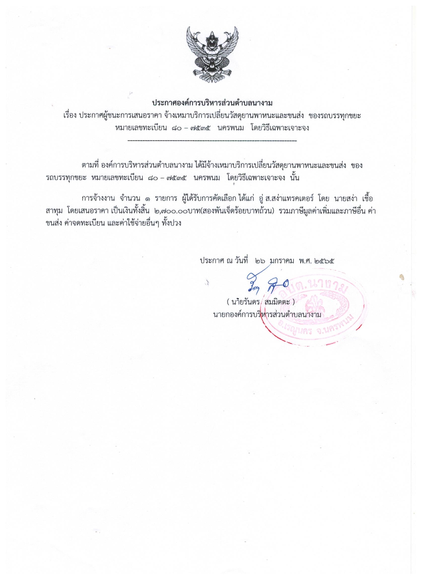 ประกาศผู้ชนะการเสนอราคา จ้างเหมาบริการเปลี่ยนวัสดุยานพาหนะและขนส่ง ของรถบรรทุกขยะ หมายเลขทะเบียน 80 – 7535 นครพนม โดยวิธีเฉพาะเจาะจง