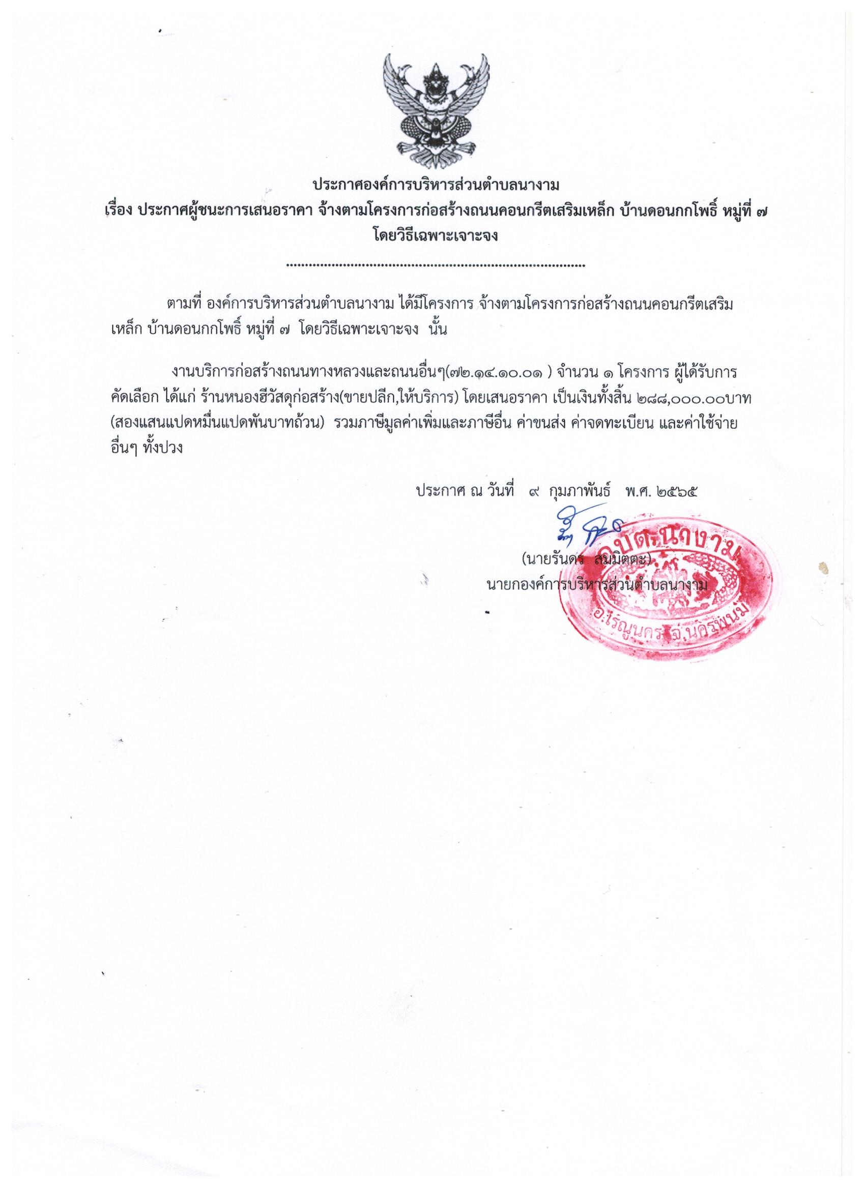 ชื่อเรื่อง : ประกาศผู้ชนะการเสนอราคา จ้างตามโครงการก่อสร้างถนนคอนกรีตเสริมเหล็ก บ้านดอนกกโพธิ์ หมู่ที่ ๗ โดยวิธีเฉพาะเจาะจง