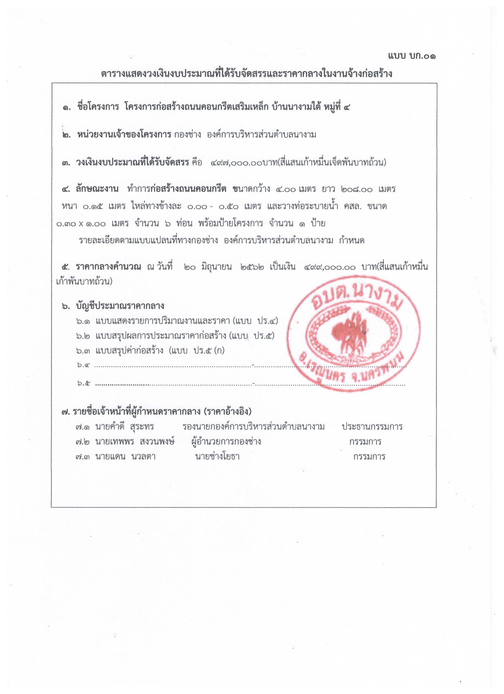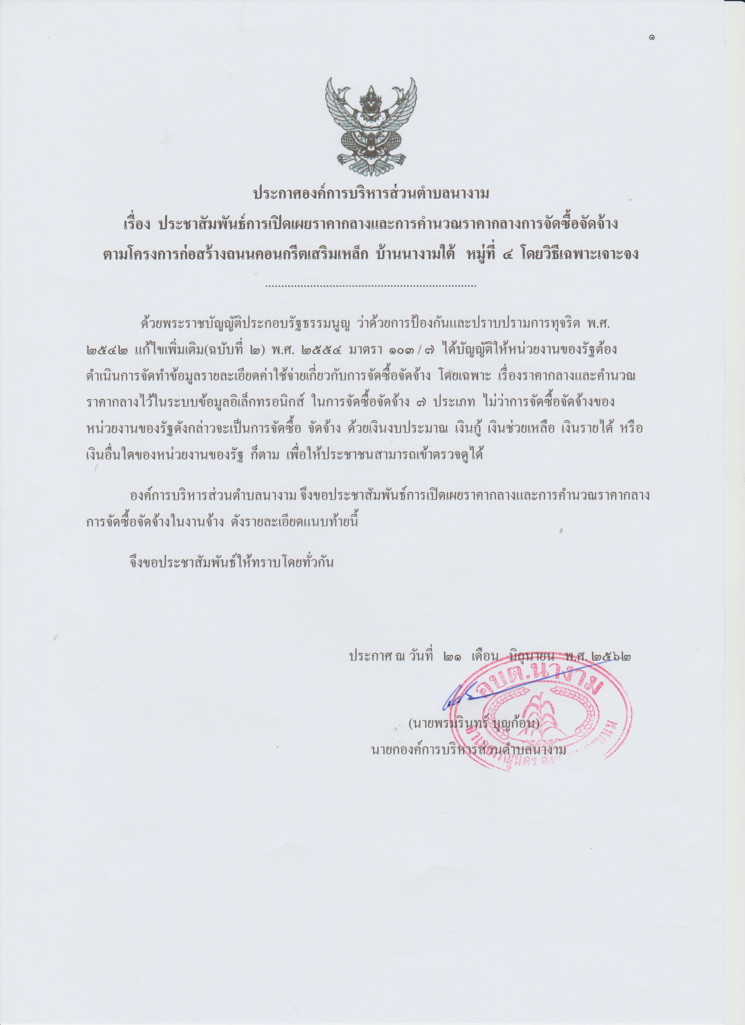 ชื่อเรื่อง : ประชาสัมพันธ์การเปิดเผยราคากลางตามโครงการก่อสร้างถนนคอนกรีตเสริมเหล็ก บ้านนางามใต้ หมู่ที่ ๔
