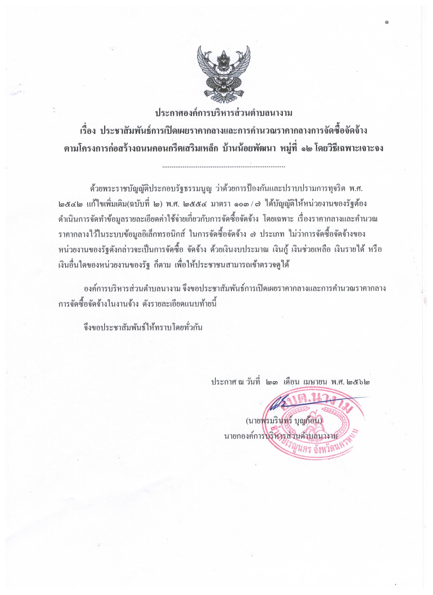 ชื่อเรื่อง : ประชาสัมพันธ์การเปิดเผยราคากลาง ตามโครงการก่อสร้างถนนคอนกรีตเสริมเหล็ก บ้านน้อยพัฒนา หมู่ที่ ๑๒