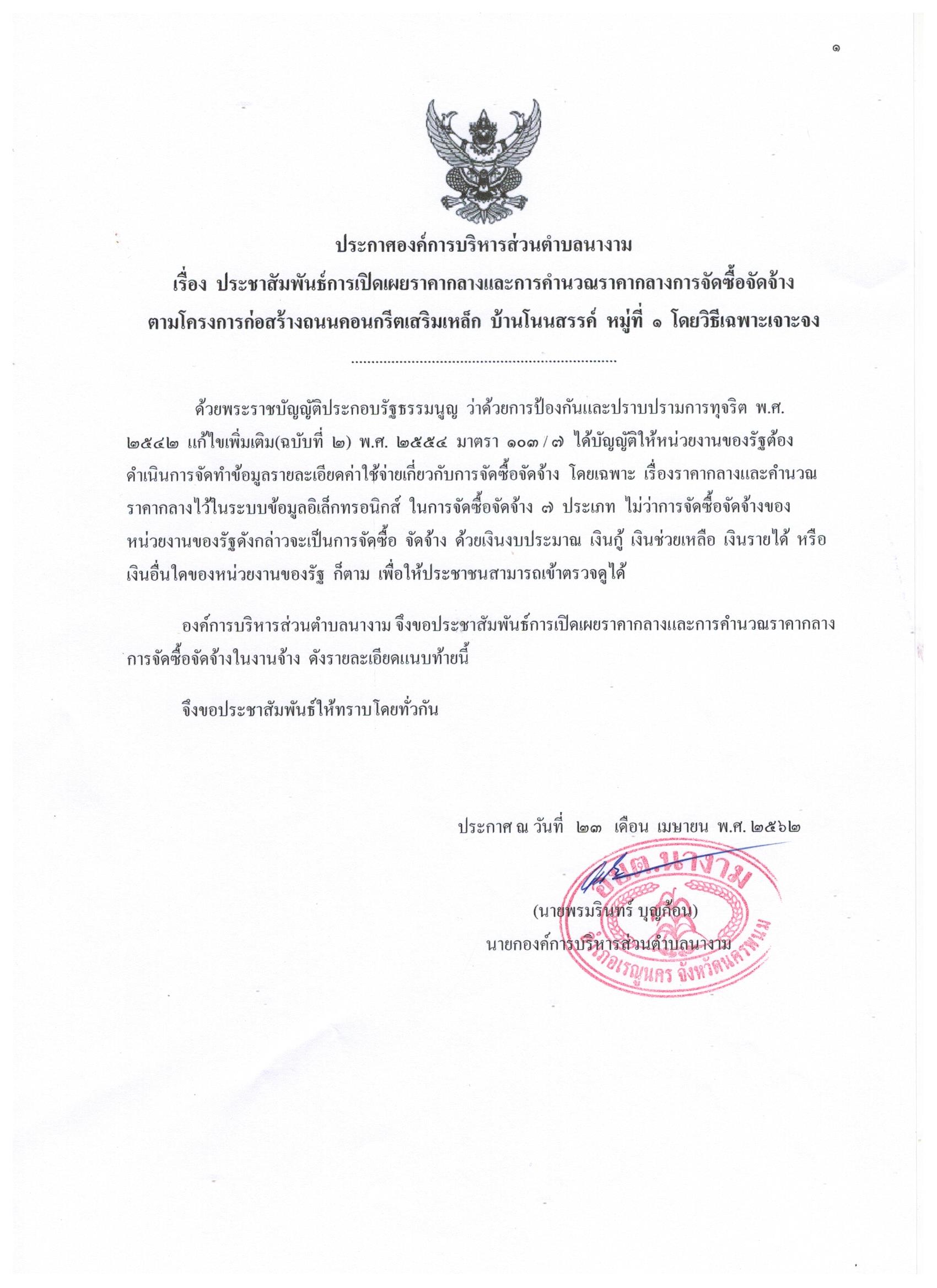 ชื่อเรื่อง : ประชาสัมพันธ์การเปิดเผยราคากลาง ตามโครงการก่อสร้างถนนคอนกรีตเสริมเหล็ก บ้านโนนสวรรค์ หมู่ที่ ๑