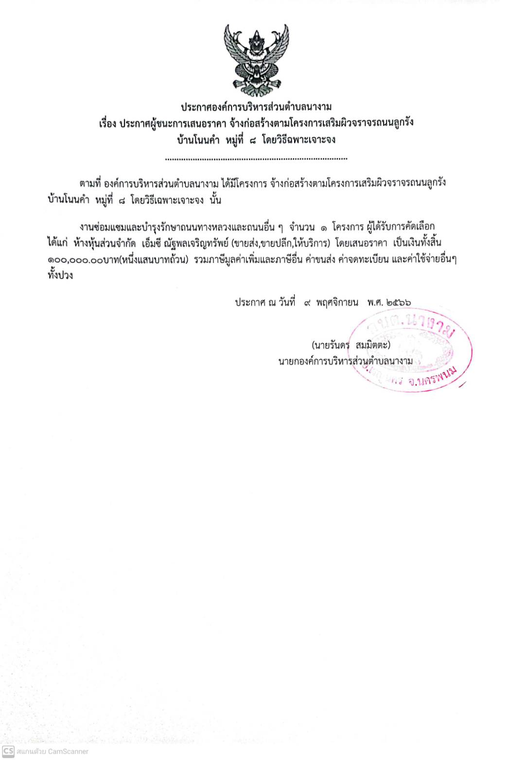 ประกาศผู้ชนะการเสนอราคา จ้างก่อสร้างตามโครงการเสริมผิวจราจรถนนลูกรัง บ้านโนนคำ หมู่ที่ 8 โดยวิธีเฉพาะเจาะจง