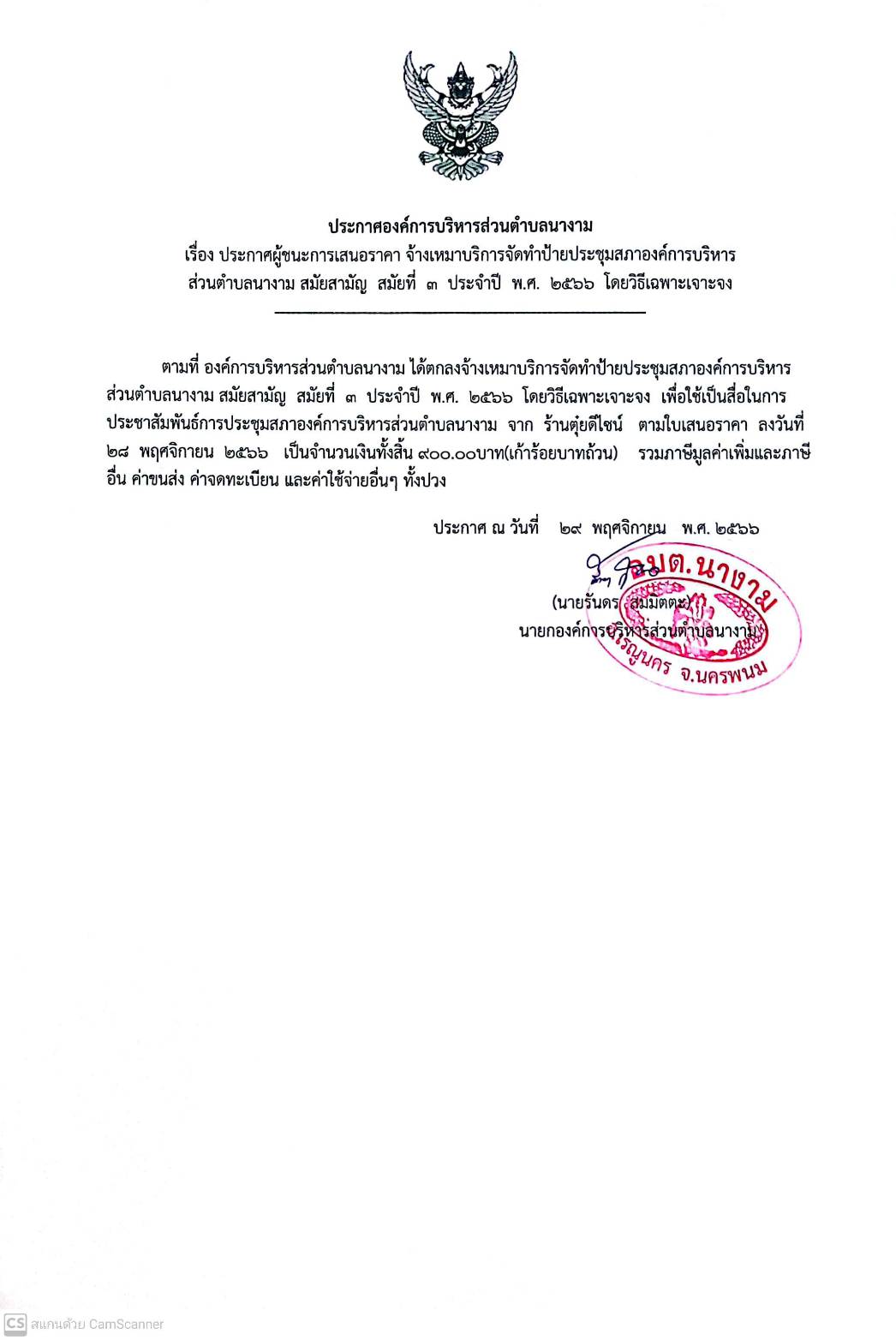 ชื่อเรื่อง : ประกาศผู้ชนะการเสนอราคา จ้างเหมาบริการจัดทำป้ายประชุมสภาองค์การบริหารส่วนตำบลนางาม สมัยสามัญ สมันที่ ๓ ประจำปี พ.ศ. ๒๕๖๖ โดยวิธีเฉพาะเจาะจง
