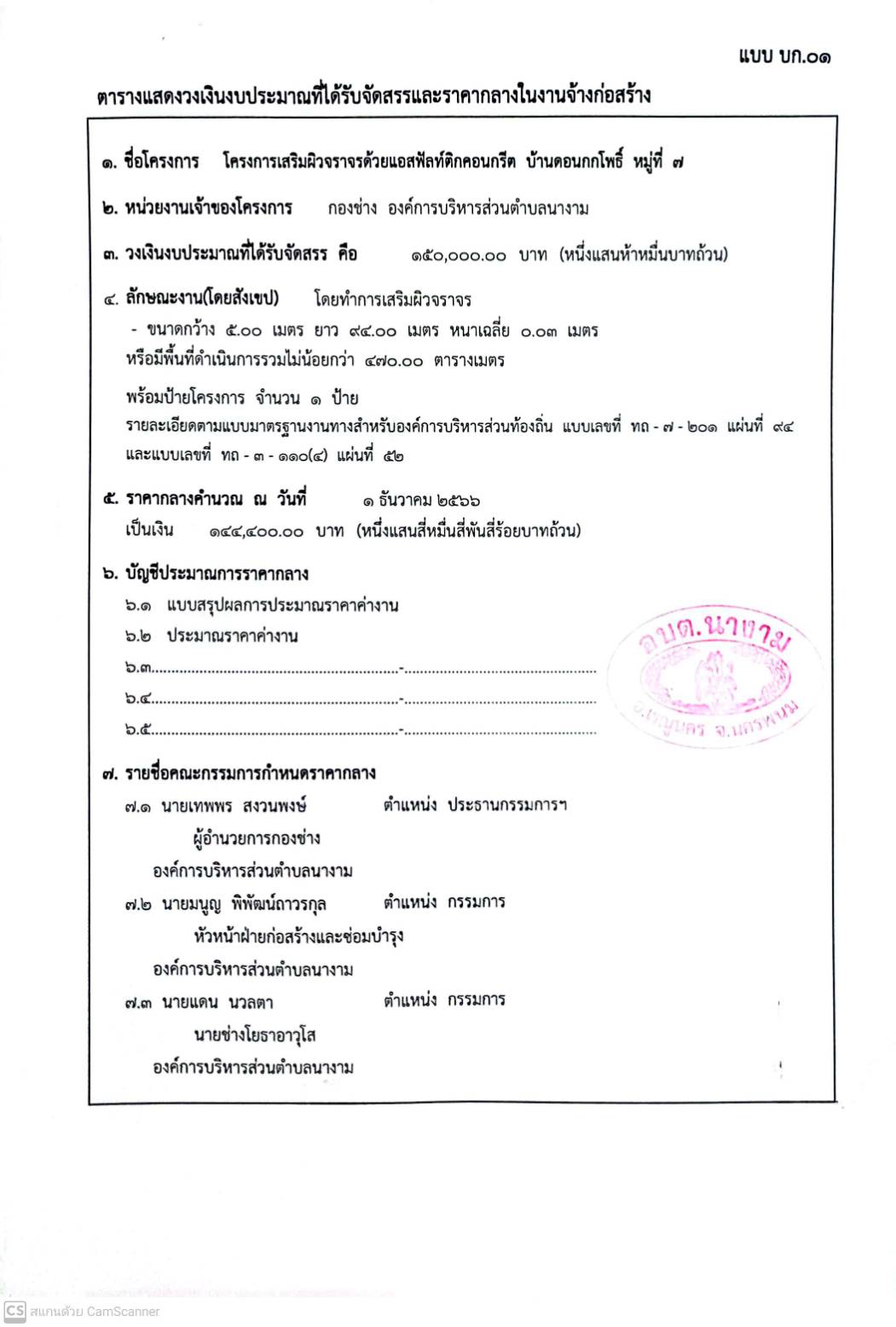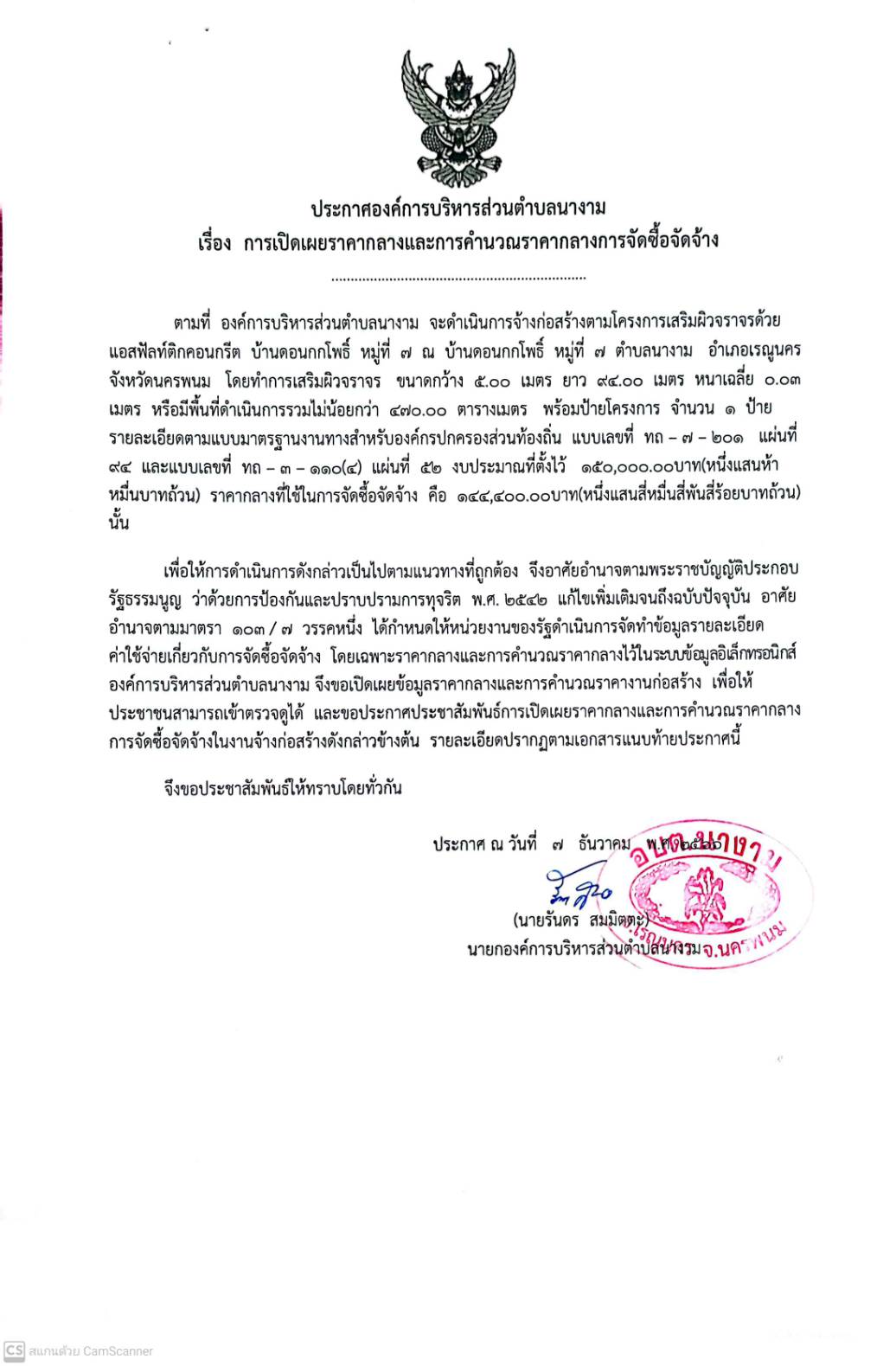 ประชาสัมพันธ์การเปิดเผยราคากลางตามโครงการเสริมผิวจราจรด้วยแอสฟัลท์ติกคอนกรีต บ้านดอนกกโพธิ์ หมู่ที่ 7