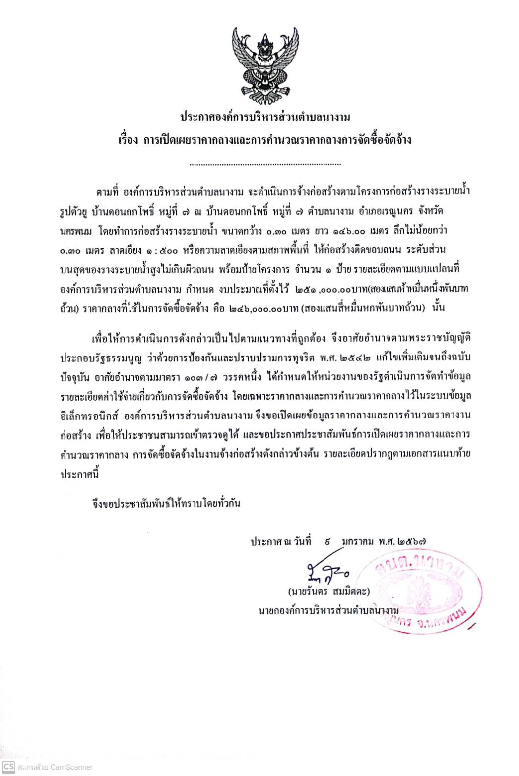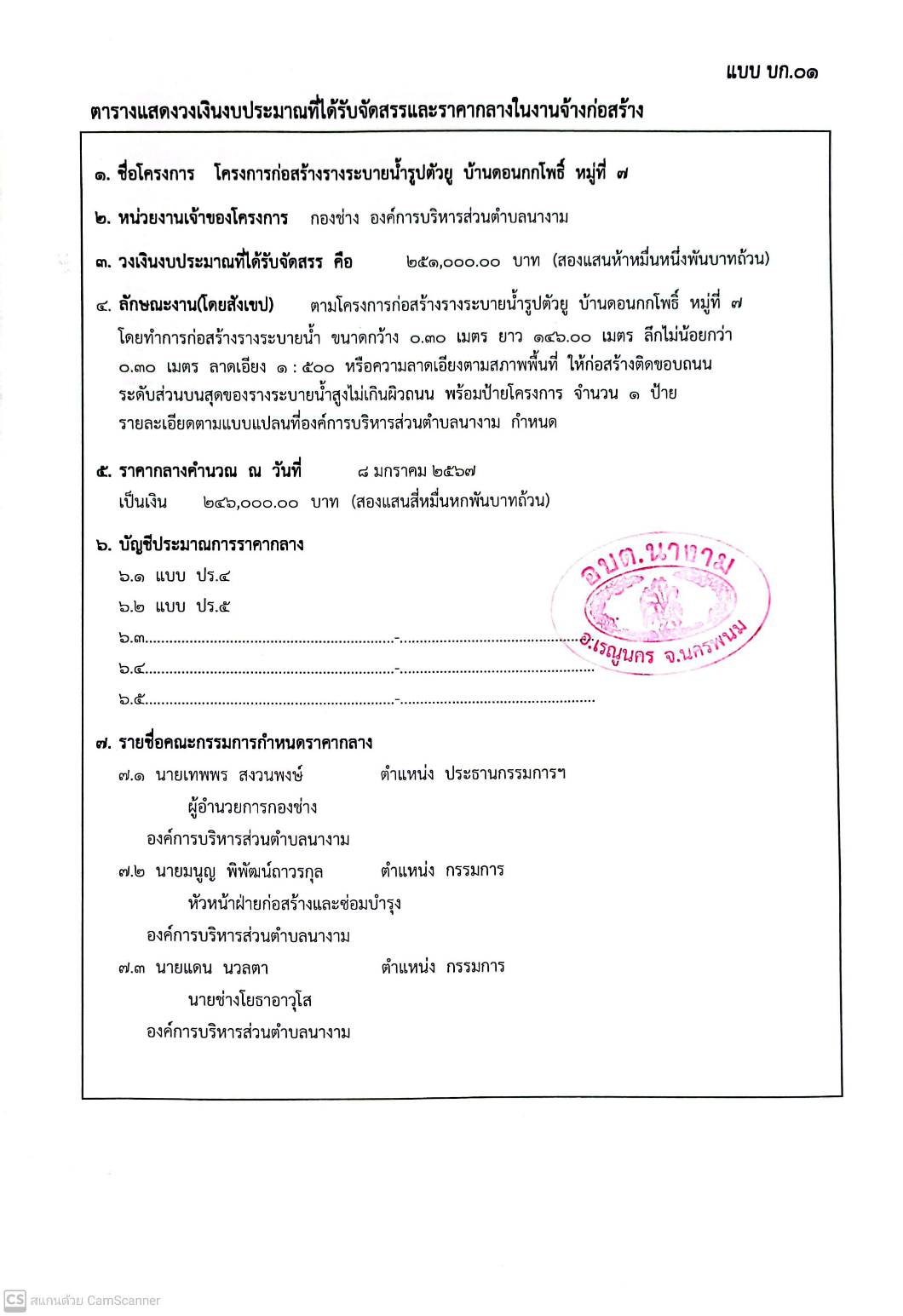 ชื่อเรื่อง : ประชาสัมพันธ์การเปิดเผยราคากลางตามโครงการก่อสร้างรางระบายน้ำรูปตัวยู บ้านดอนกกโพธิ์ หมู่ที่ 7