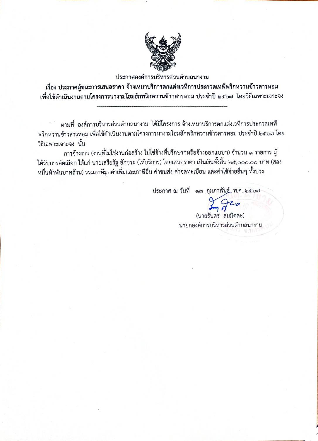 ประกาศผู้ชนะการเสนอราคา จ้างเหมาบริการตกแต่งเวทีการประกวดเทพีพริกหวานข้าวสารหอม เพื่อใช้ดำเนินงานตามโครงการนางามโฮมฮักพริกหวานข้าวสารหอม ประจำปี ๒๕๖๗ โดยวิธีเฉพาะเจาะจง