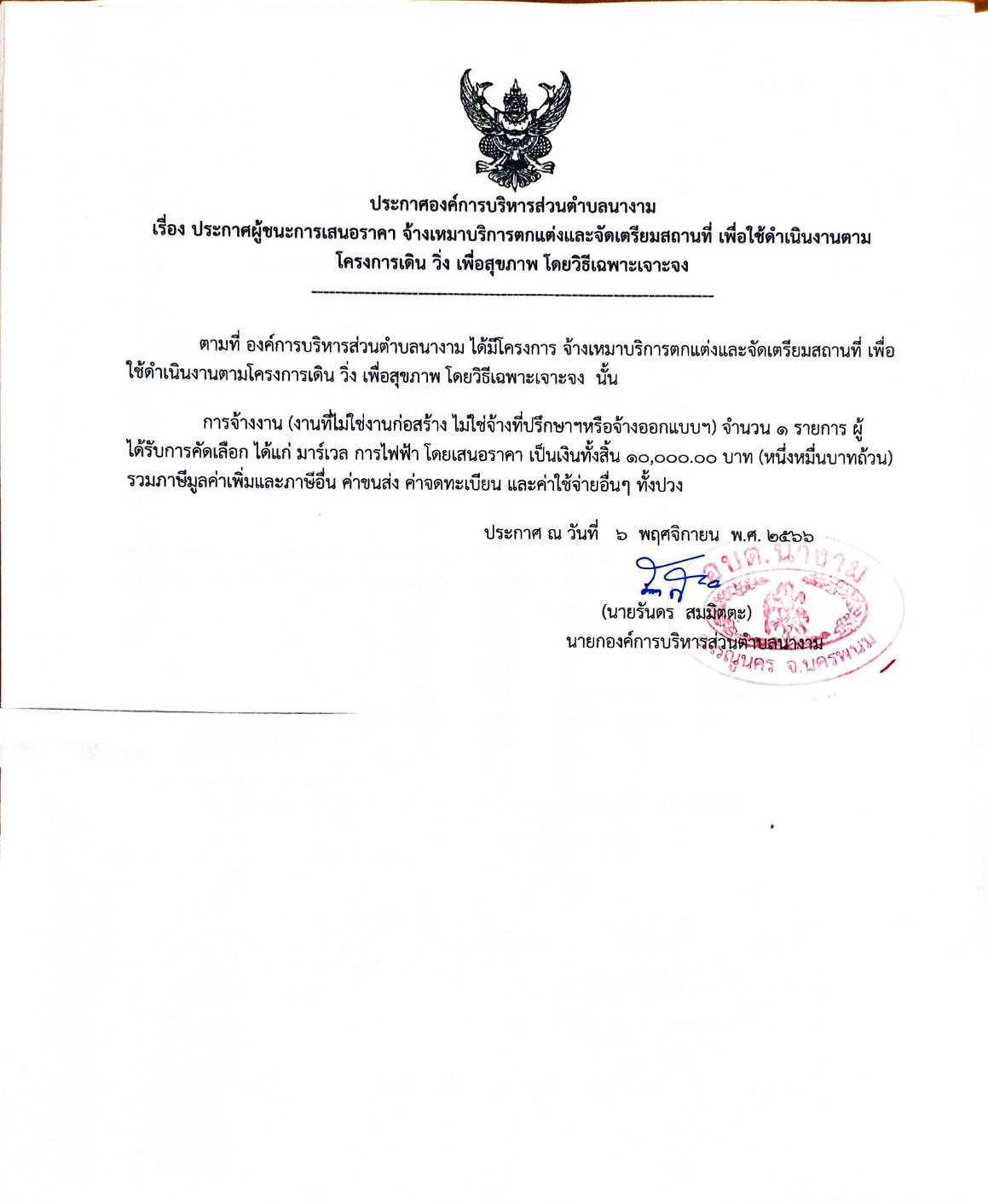 ชื่อเรื่อง : ประกาศผู้ชนะการเสนอราคา จ้างเหมาบริการตกแต่งและจัดเตรียมสถานที่ เพื่อใช้ดำเนินงานตามโครงการเดิน วิ่ง เพื่อสุขภาพ โดยวิธีเฉพาะเจาะจง