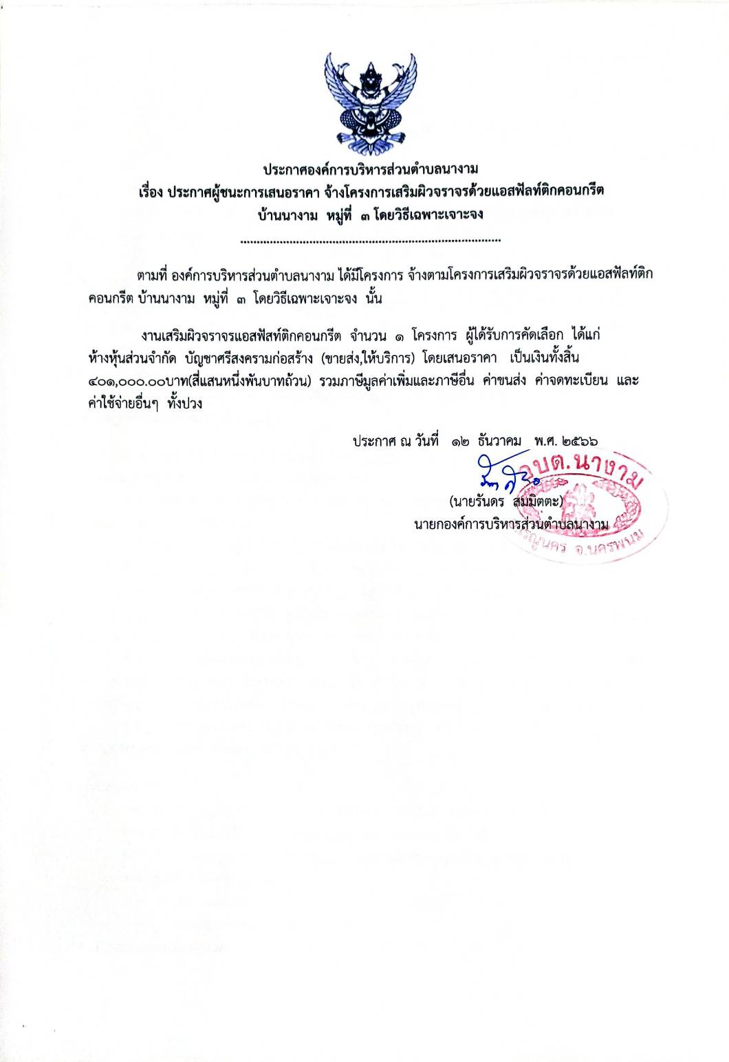 ชื่อเรื่อง : ประกาศผู้ชนะการเสนอราคา จ้างโครงการเสริมผิวจราจรด้วยแอสฟัลท์ติกคอนกรีต บ้านนางาม หมู่ที่ ๓ โดยวิธีเฉพาะเจาะจง