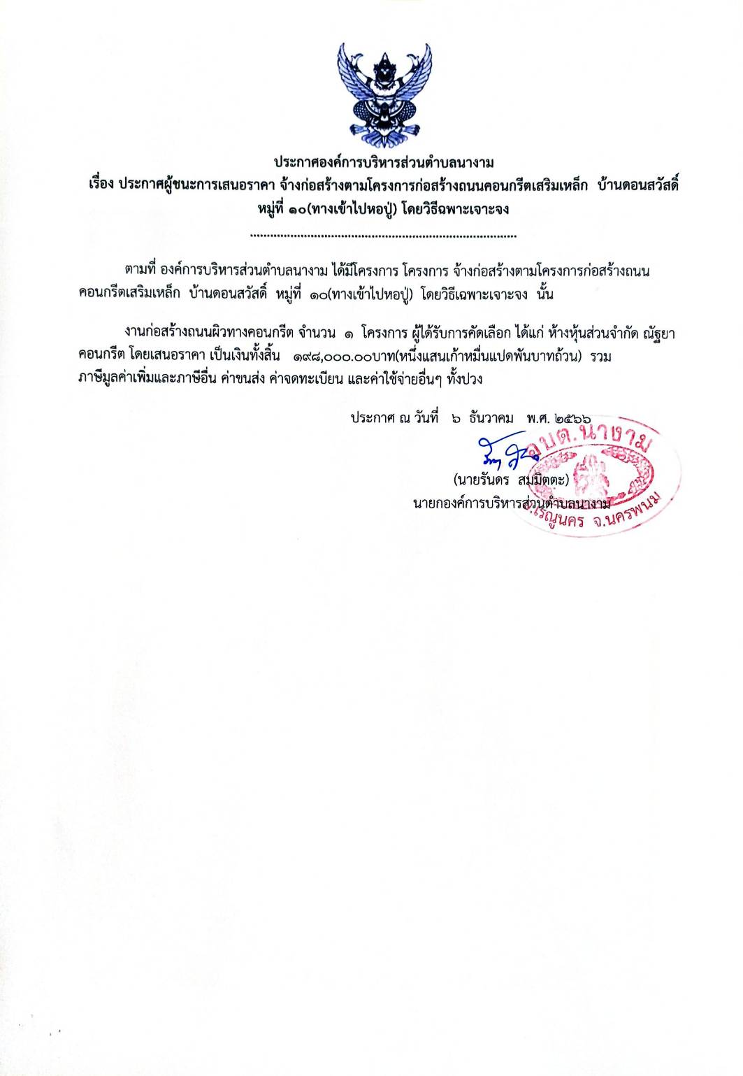 ประกาศผู้ชนะการเสนอราคา จ้างก่อสร้างตามโครงการก่อสร้างถนนคอนกรีตเสริมเหล็ก บ้านดอนสวัสดิ์ หมู่ที่ ๑๐(ทางเข้าไปหอปู่) โดยวิธีเฉพาะเจาะจง