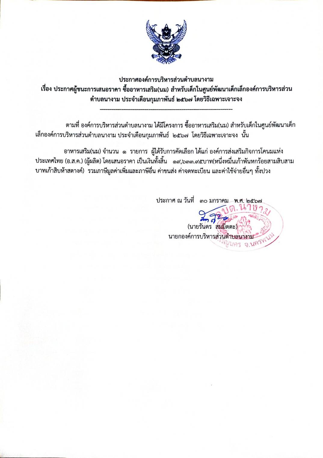 ประกาศผู้ชนะการเสนอราคา ซื้ออาหารเสริม(นม) สำหรับเด็กในศูนย์พัฒนาเด็กเล็กองค์การบริหารส่วนตำบลนางาม ประจำเดือนกุมภาพันธ์ ๒๕๖๗ โดยวิธีเฉพาะเจาะจง