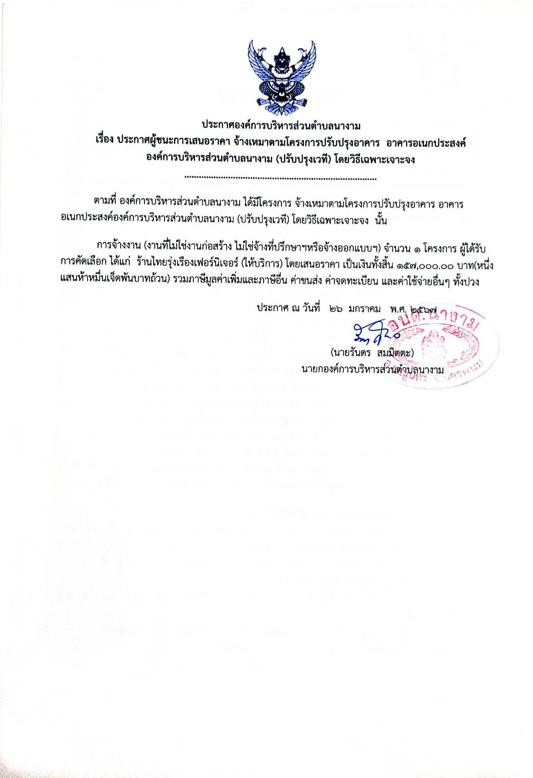 ชื่อเรื่อง : ประกาศผู้ชนะการเสนอราคา จ้างเหมาตามโครงการปรับปรุงอาคาร อาคารอเนกประสงค์องค์การบริหารส่วนตำบลนางาม (ปรับปรุงเวที) โดยวิธีเฉพาะเจาะจง