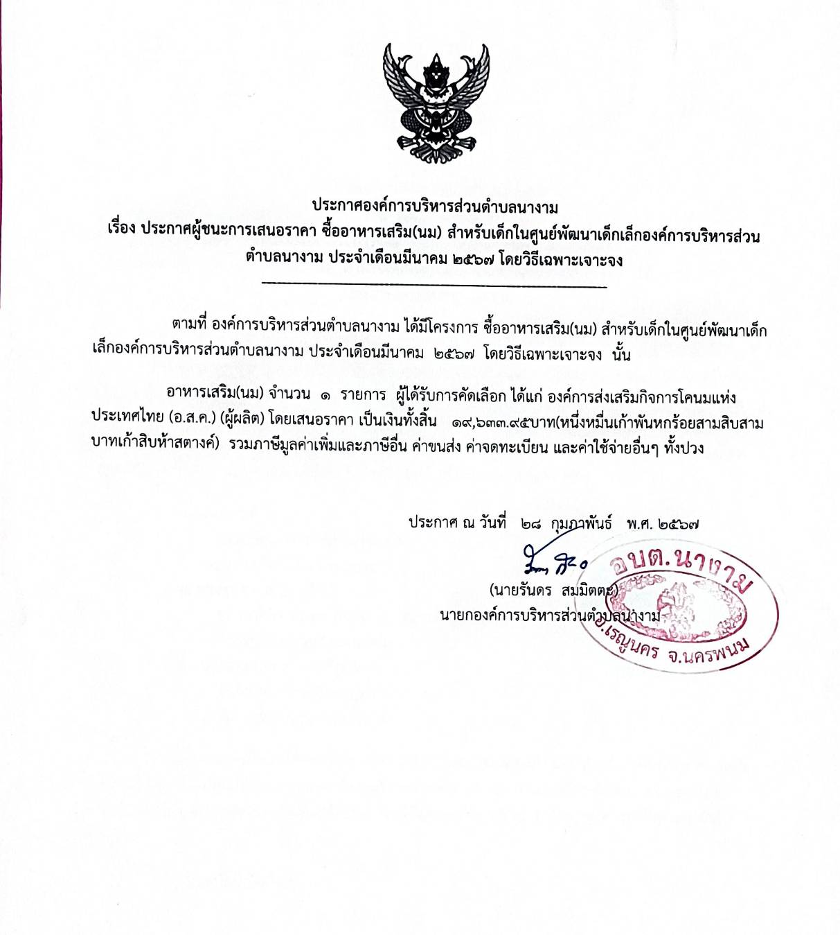 ประกาศผู้ชนะการเสนอราคา ซื้ออาหารเสริม(นม) สำหรับเด็กในศูนย์พัฒนาเด็กเล็กองค์การบริหารส่วนตำบลนางาม ประจำเดือนมีนาคม ๒๕๖๗ โดยวิธีเฉพาะเจาะจง
