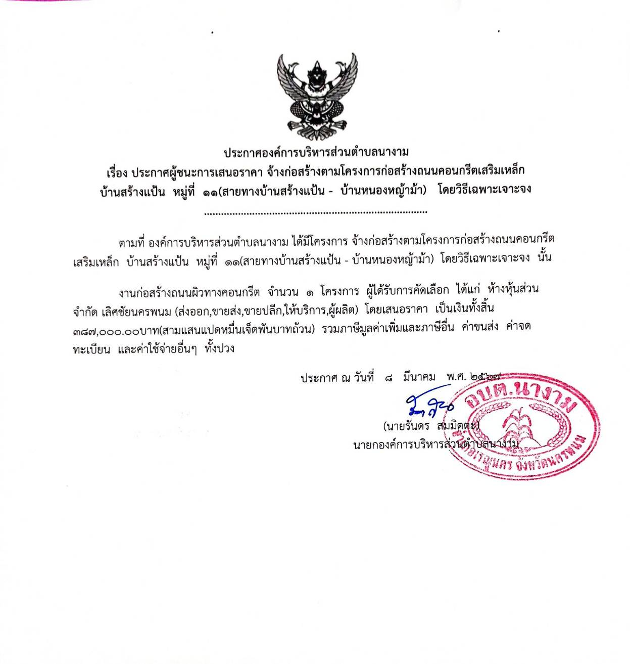 ประกาศผู้ชนะการเสนอราคา จ้างก่อสร้างตามโครงการก่อสร้างถนนคอนกรีตเสริมเหล็ก บ้านสร้างแป้น หมู่ที่ ๑๑(สายทางบ้านสร้างแป้น - บ้านหนองหญ้าม้า) โดยวิธีเฉพาะเจาะจง