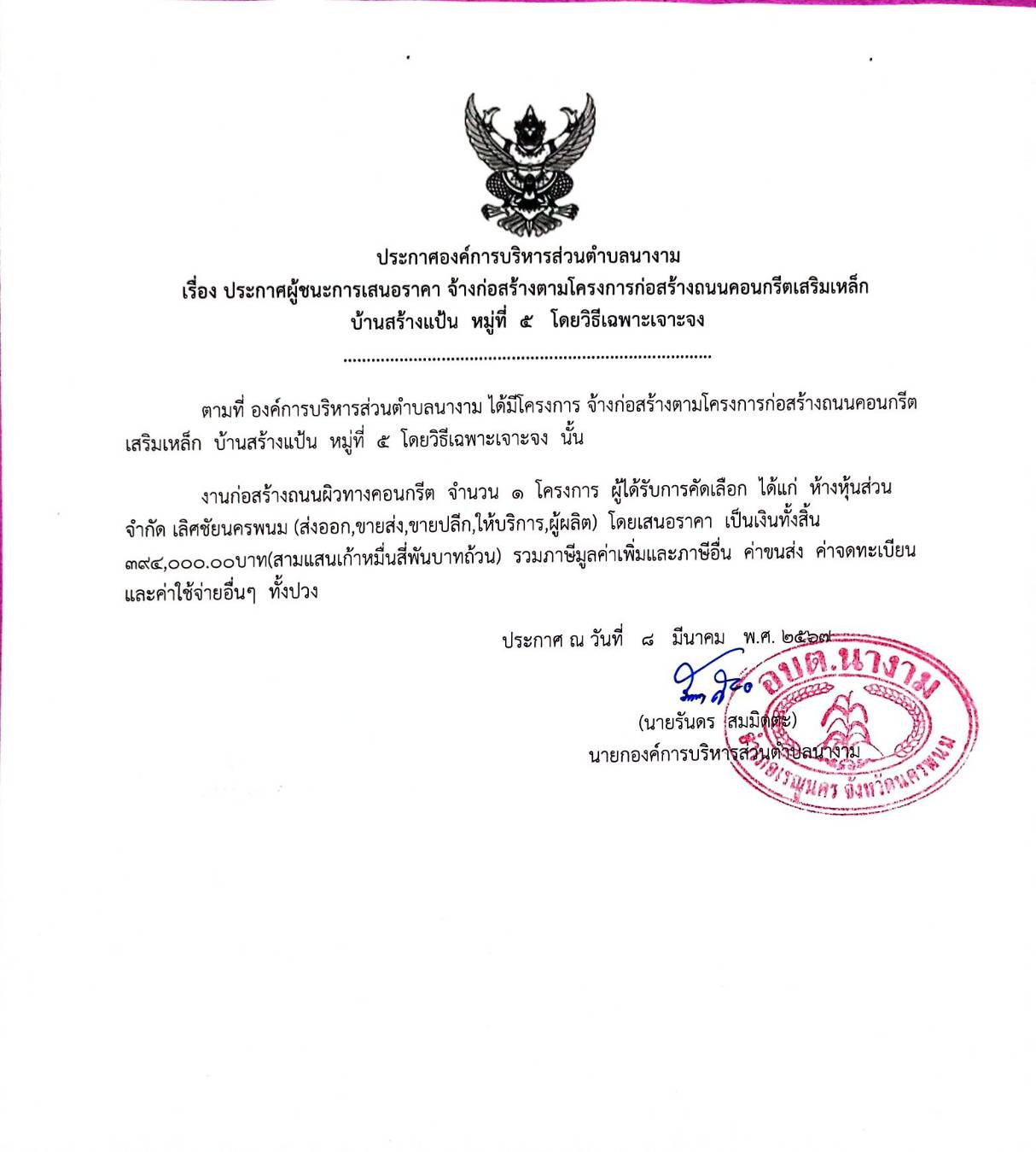 ประกาศผู้ชนะการเสนอราคา จ้างก่อสร้างตามโครงการก่อสร้างถนนคอนกรีตเสริมเหล็ก บ้านสร้างแป้น หมู่ที่ ๕ โดยวิธีเฉพาะเจาะจง