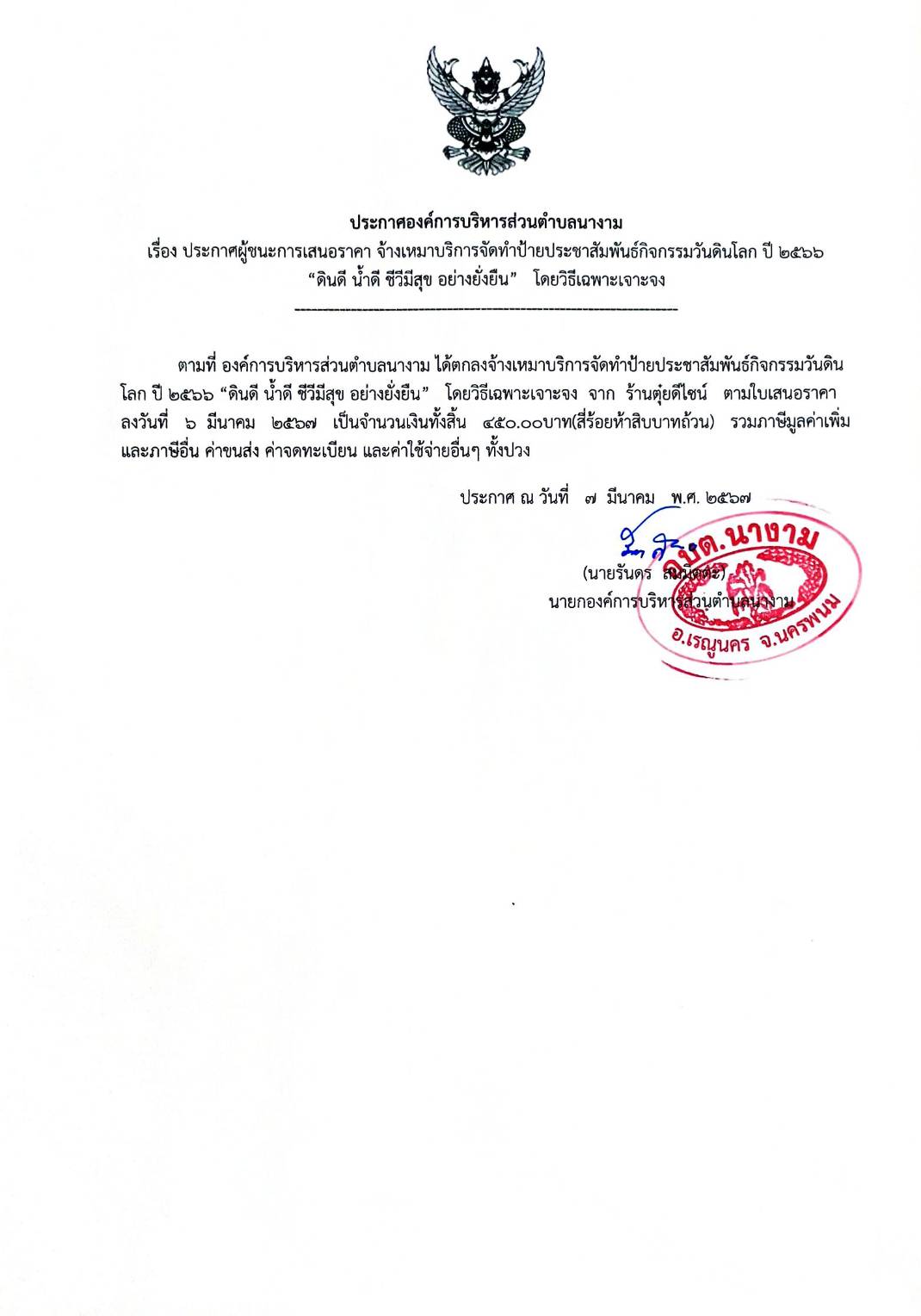 ประกาศผู้ชนะการเสนอราคา จ้างเหมาบริการจัดทำป้ายประชาสัมพันธ์กิจกรรมวันดินโลก ปี ๒๕๖๖ "ดินดี น้ำดี ชีวีมีสุข อย่างยั่งยืน" โดยวิธีเฉพาะเจาะจง