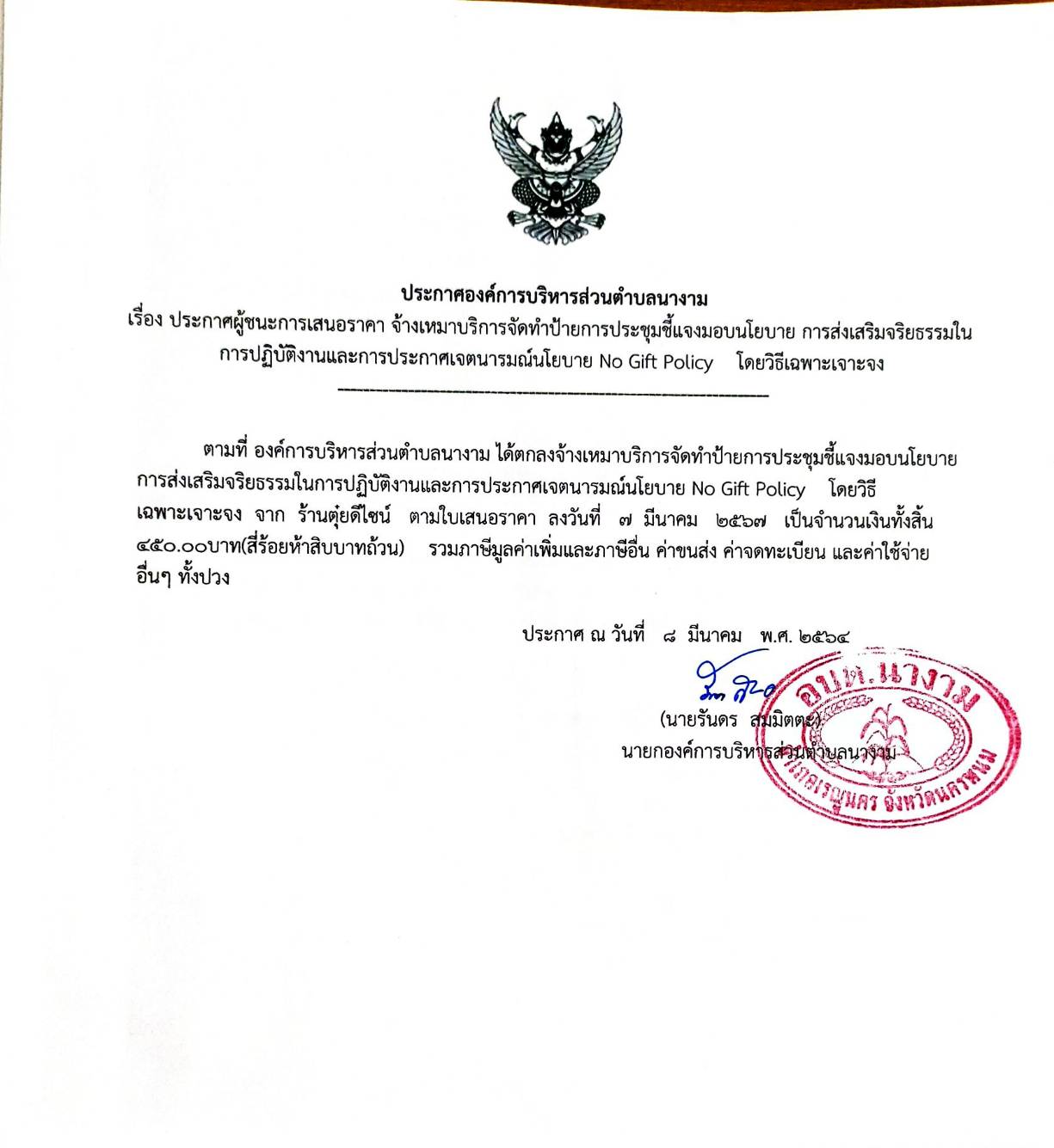 ประกาศผู้ชนะการเสนอราคา จ้างเหมาบริการจัดทำป้ายการประชุมชี้เเจงมอบนโยบาย การส่งเสริมจริยธรรมในการปฏิบัติงานและการประกาศเจตนารมณ์นโยบาย No Gift Policy โดยวิธีเฉพาะเจาะจง