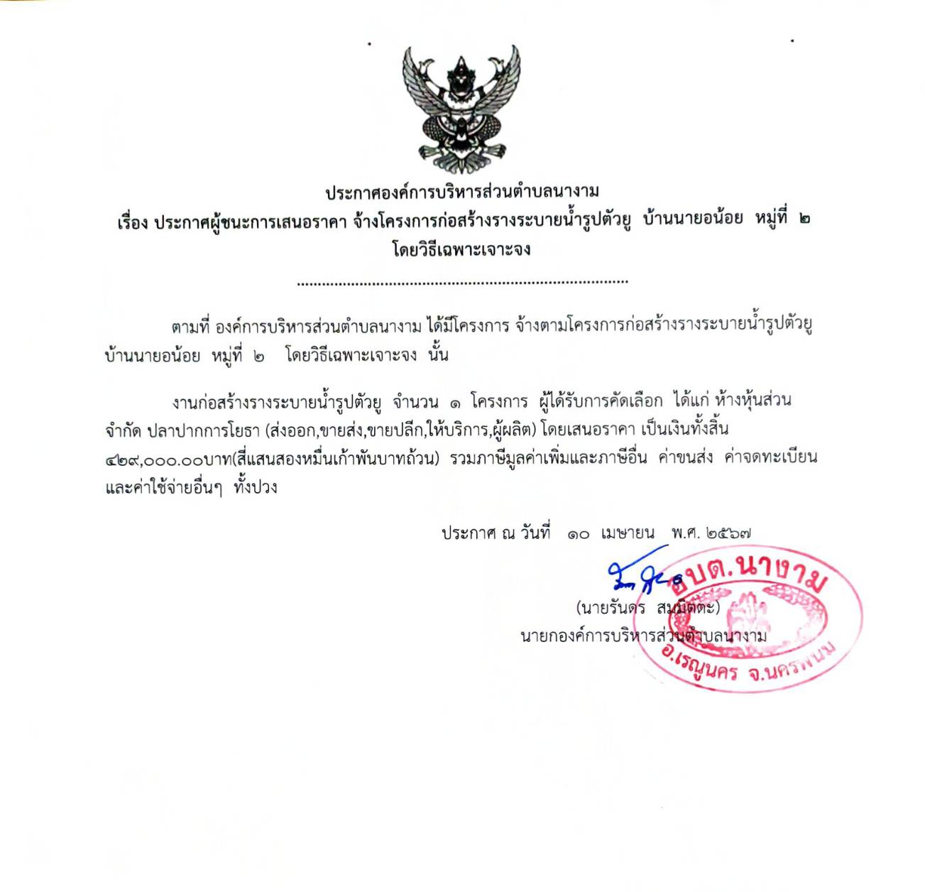 ชื่อเรื่อง : ประกาศผู้ชนะการเสนอราคา จ้างก่อสร้างตามโครงการก่อสร้างรางระบายน้ำรูปตัวยู บ้านนายอน้อย หมู่ที่ ๒ โดยวิธีเฉพาะเจาะจง