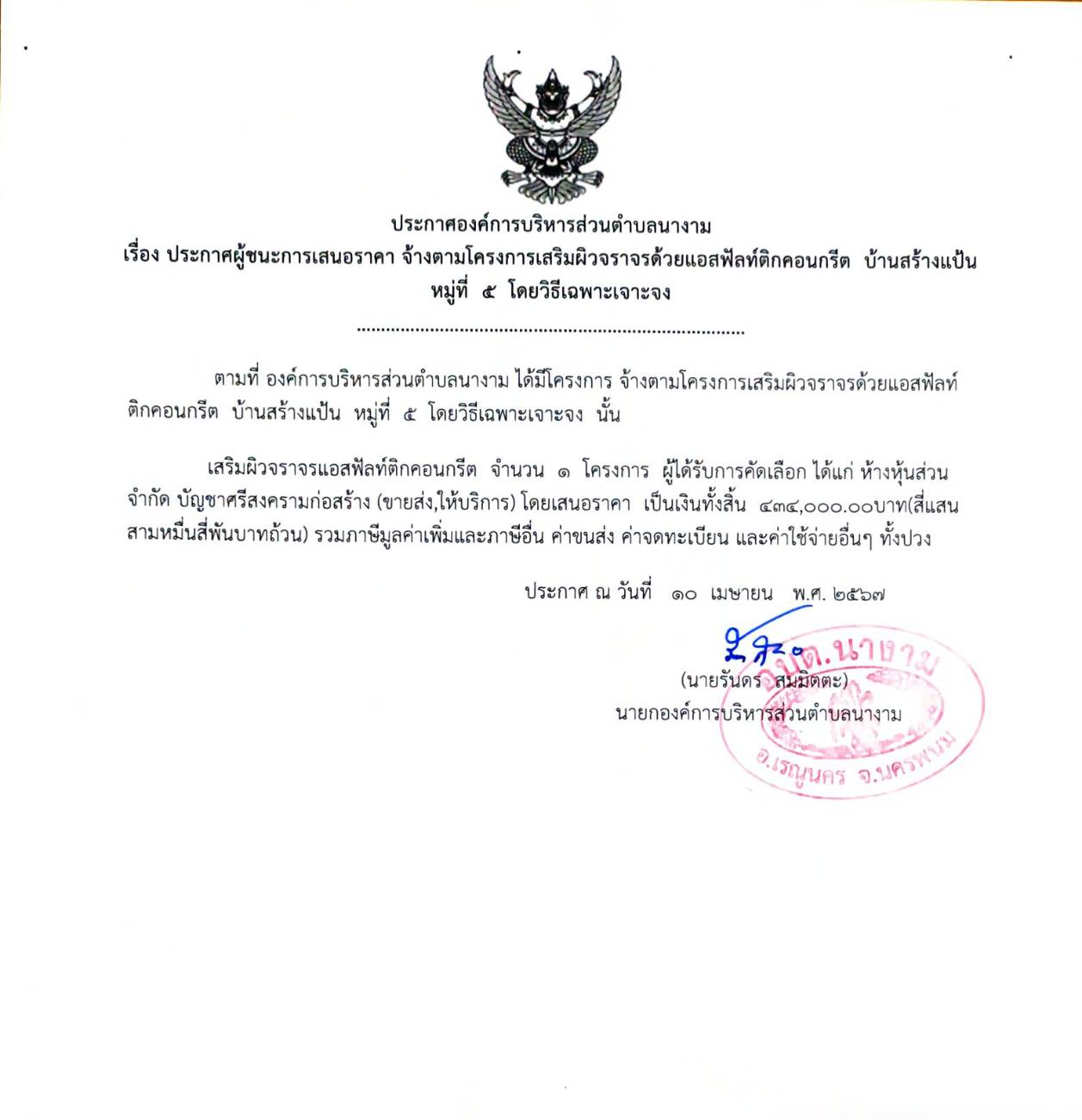 ประกาศผู้ชนะการเสนอราคา จ้างก่อสร้างตามโครงการเสริมผิวจราจรด้วยแอสฟัลท์ติกคอนกรีต บ้านสร้างแป้น หมู่ที่ ๕ โดยวิธีเฉพาะเจาะจง