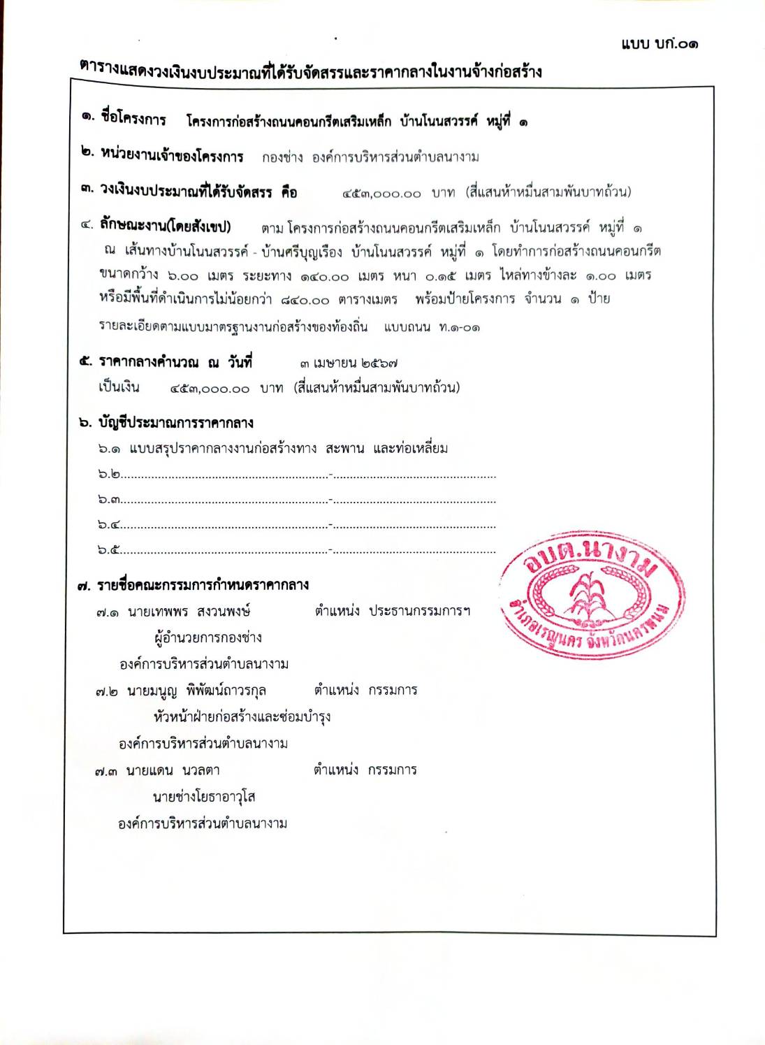 ประชาสัมพันธ์การเปิดเผยราคากลางตามโครงการก่อสร้างถนนคอนกรีตเสริมเหล็ก บ้านโนนสวรรค์ หมู่ที่ ๑