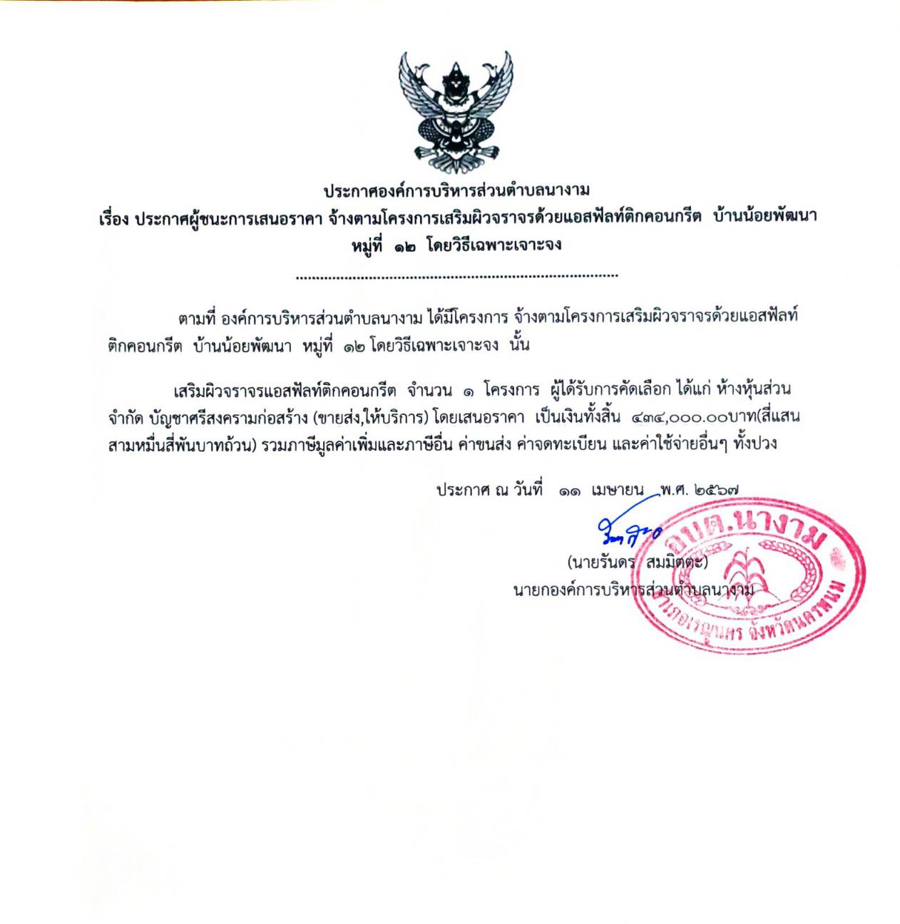 ชื่อเรื่อง : ประกาศผู้ชนะการเสนอราคา จ้างก่อสร้างตามโครงการเสริมผิวจราจรด้วยแอสฟัลท์ติกคอนกรีต บ้านน้อยพัมนา หมู่ที่ ๑๒ โดยวิธีเฉพาะเจาะจง