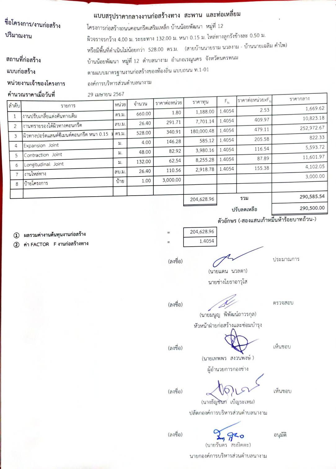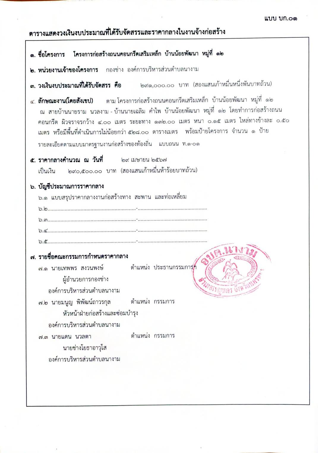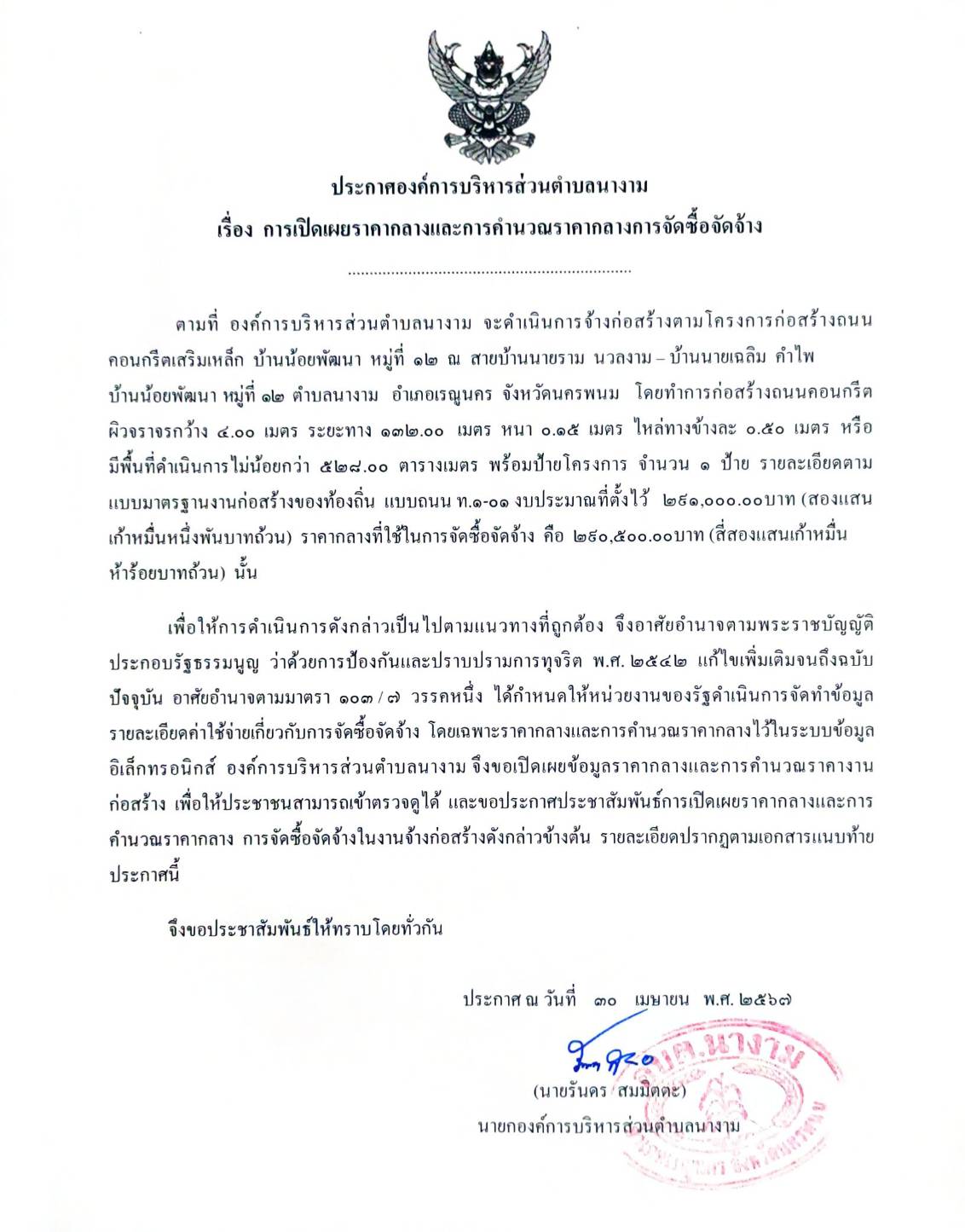 ประชาสัมพันธ์การเปิดเผยราคากลางตามโครงการก่อสร้างถนนคอนกรีตเสริมเหล็ก บ้านน้อยพัฒนา หมู่ที่ ๑๒