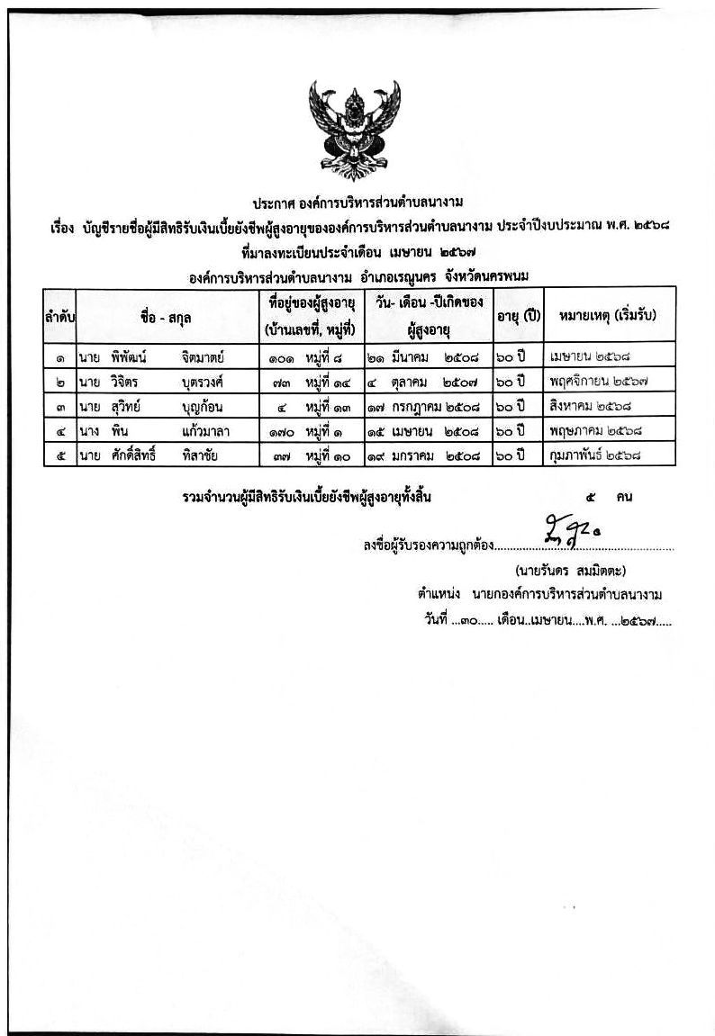 ชื่อเรื่อง : ประกาศองค์การบริหารส่วนตำบลนางาม เรื่อง บัญชีรายชื่อผู้มีสิทธิรับเงินเบี้ยยังชีพผู้สูงอายุขององค์การบริหารส่วนตำบลนางาม ประจำปีงบประมาณ พ.ศ. 2568 ที่มาลงทะเบียนประจำเดือน เมษายน 2567