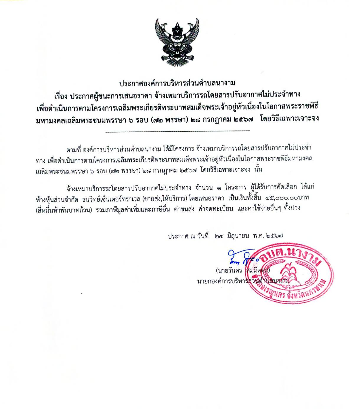 ชื่อเรื่อง : ประกาผู้ชนะการเสนอราคา จ้างเหมาบริการรถโดยสารปรับอากาศไม่ประจำทาง เพื่อดำเนินการตามโครงการเฉลิมพระเกียรติพระบาทสมเด็จพระเจ้าอยู่หัวเนื่องในโอกาสพระราชพิธีมหามงคลเฉลิมพระชนมพรรษา ๖ รอบ (๗๒ พรรษา) ๒๘ กรกฎาคม ๒๕๖๗