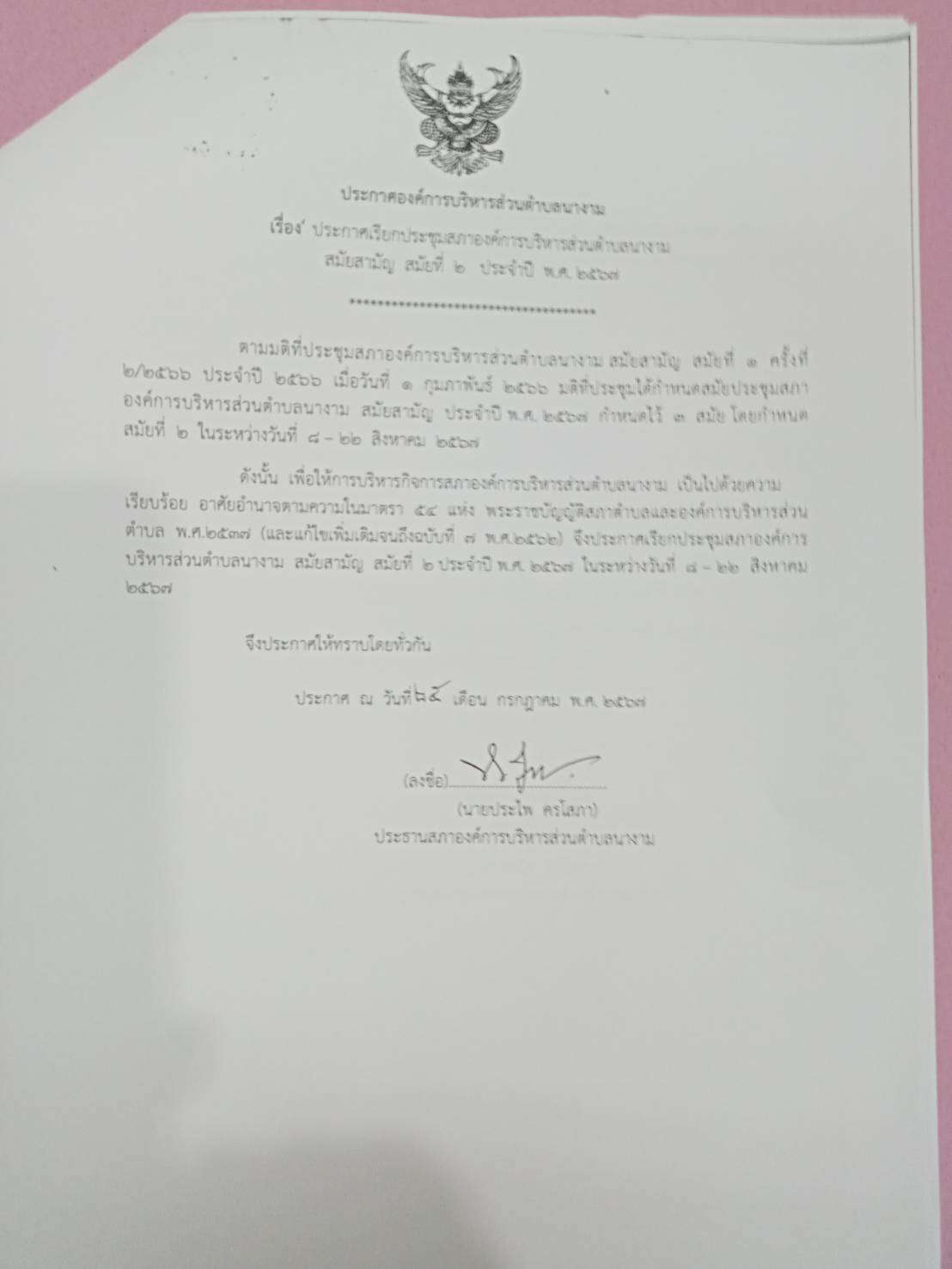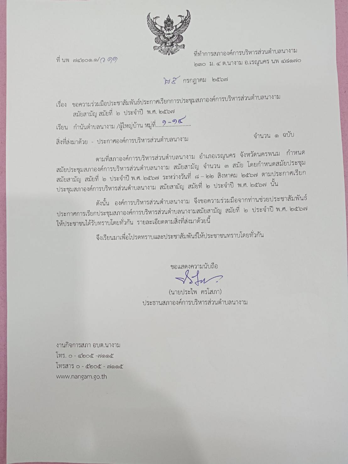 ชื่อเรื่อง : ขอความร่วมมือประชาสัมพันธ์ประกาศเรียกการประชุมสภาองค์การบริหารส่วนตำบลนางาม สมัยสามัญ สมัยที่ 2 ประจำปี พ.ศ.2567