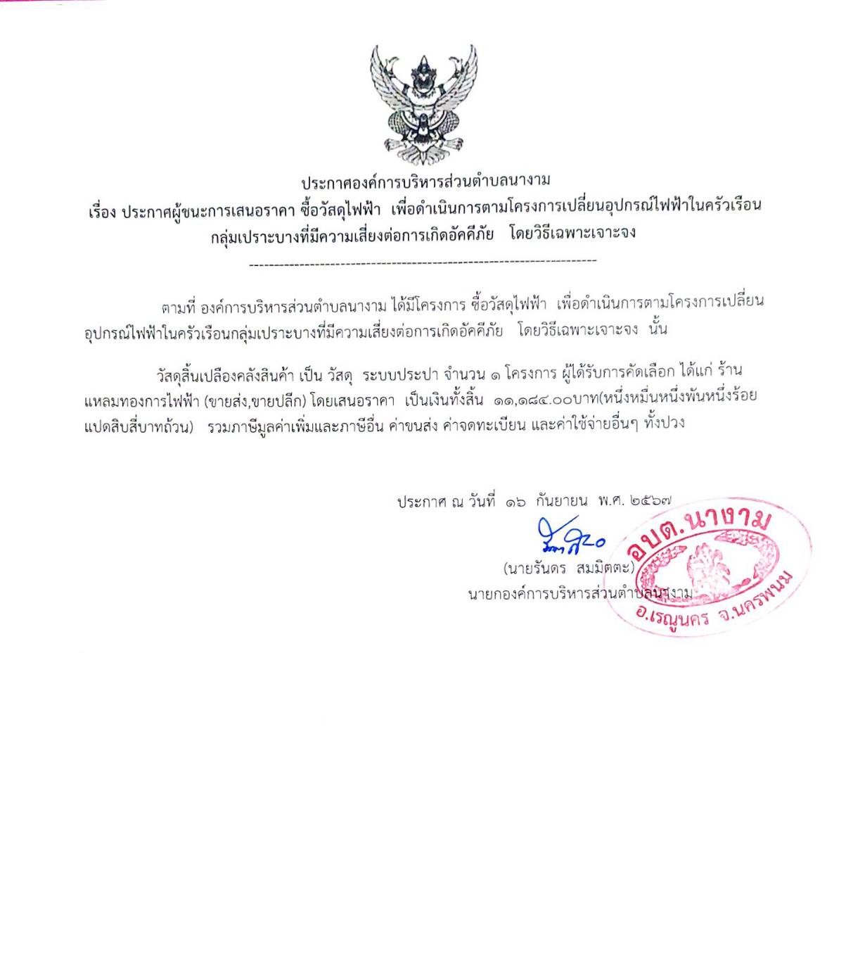 ประกาศผู้ชนะการเสนอราคา ซื้อวัสดุไฟฟ้า เพื่อดำเนินการตามโครงการเปลี่ยนอุปกรณ์ไฟฟ้าในครัวเรือนกลุ่มเปราะบางที่มีความเสี่ยงต่อการเกิดอัคคีภัย โดยวิธีเฉพาะเจาะจง
